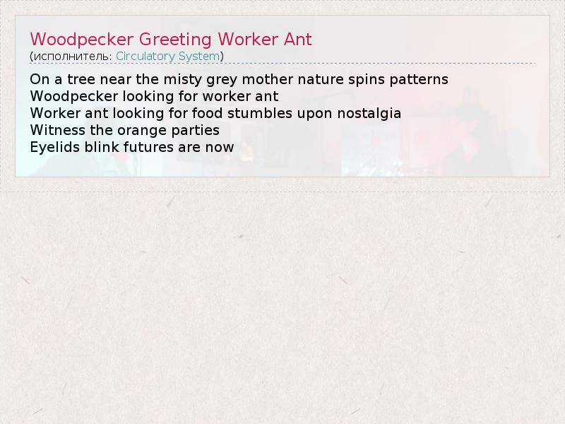 ГлавнаяИсполнителиCirculatory SystemWoodpecker Greeting Worker Ant