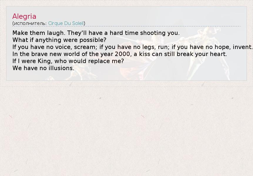 Это интересно:Цирк Солнца (Cirque du Soleil) — яркий представитель современного жанра циркового искусства. Компания основана в 1984 году Ги Лалиберте (Guy Laliberté) и Даниэлем Готье (Daniel Gauthier) и базируется в Монреале, Канада.Цирк Солнца насчитывает более 4000 человек, работающих в разных труппах, что позволяет компании давать представления в нескольких точках мира одновременно. Выступает со зрелищными спектаклями,... продолжение