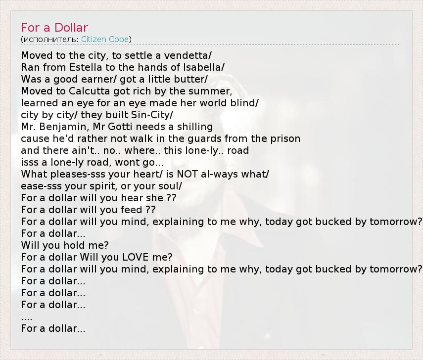 А как ты думаешь, о чем песня "For a Dollar" ?
