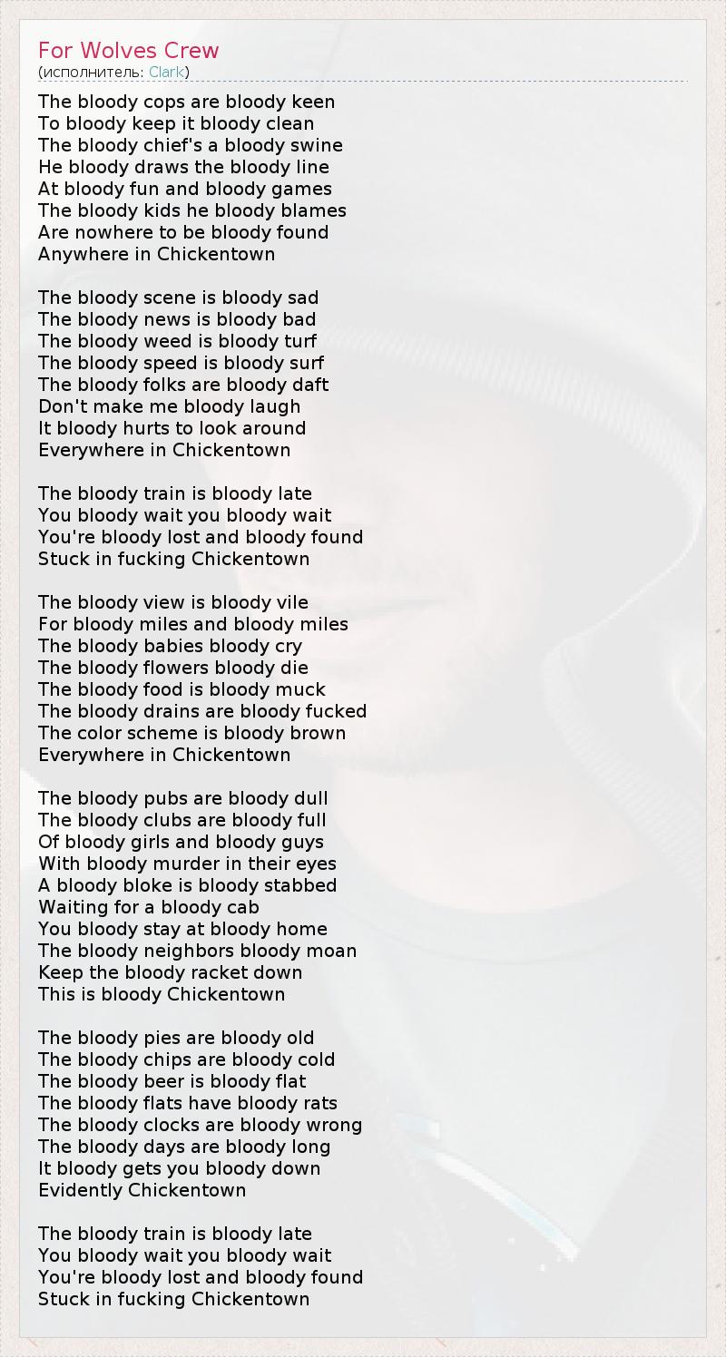 The bloody cops are bloody keen To bloody keep it bloody clean The bloody chief's a bloody swine He bloody draws the bloody line At bloody fun and bloody games The bloody kids he bloody blames Are nowhere to be bloody found Anywhere in Chickentown The bloody scene is bloody sad The bloody news is bloody bad The bloody weed is bloody turf The bloody speed is bloody surf The bloody folks are bloody daft Don't make me bloody laugh It bloody hurts to look around Everywhere in Chickentown The bloody train is bloody late You bloody wait you bloody wait You're bloody lost and bloody found Stuck in fucking Chickentown The bloody view is bloody vile For bloody miles and bloody miles The bloody babies bloody cry The bloody flowers bloody die The bloody food is bloody muck The bloody drains are bloody fucked The color scheme is bloody brown Everywhere in Chickentown The bloody pubs are bloody dull The bloody clubs are bloody full Of bloody girls and bloody guys With bloody murder in their eyes A bloody bloke is bloody stabbed Waiting for a bloody cab You bloody stay at bloody home The bloody neighbors bloody moan Keep the bloody racket down This is bloody Chickentown The bloody pies are bloody old The bloody chips are bloody cold The bloody beer is bloody flat The bloody flats have bloody rats The bloody clocks are bloody wrong The bloody days are bloody long It bloody gets you bloody down Evidently Chickentown The bloody train is bloody late You bloody wait you bloody wait You're bloody lost and bloody found Stuck in fucking Chickentown
