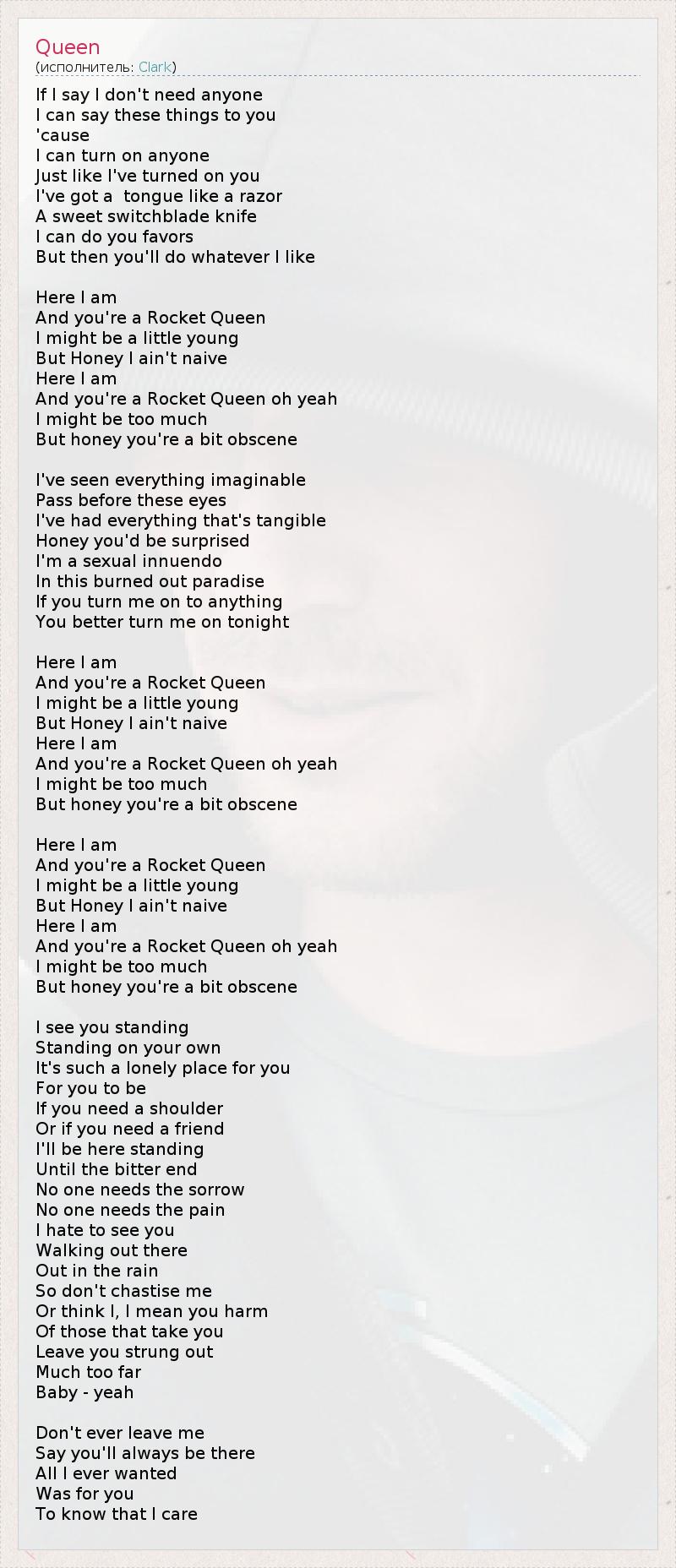 Если я скажу, что мне никто не нужен, Я могу сказать это и тебе. Потому что: Я могу соблазнить любую, Так же как и тебя. У меня язык как бритва, Сладкий перочинный нож. Я могу сделать тебе приятное. А затем,ты сделаешь то,что нравится мне. Вот и я, И ты Ракетная Королева. Может быть я молод, Но, сладкая, я не наивен. Вот и я, И ты Королева Ракет,о да! Я может слишком нетерпелив, Но, сладкая, ты такая порочная. Я видел все мыслимые фантазии, Пронёсшиеся в твоих глазах, У меня было своя реальность, А ты была поражена ею. Я был сексуален. Внутри горело райское возбуждение. Если ты хочешь меня хоть немного, То лучше соблазни меня сегодня. Вот и я, И ты Ракетная Королева. Может быть я молод, Но, сладкая, я не наивен. Вот и я, И ты Королева Ракет,о да! Я может слишком нетерпелив, Но, сладкая, ты такая порочная. Вот и я, И ты Ракетная Королева. Может быть я молод, Но, сладкая, я не наивен. Вот и я, И ты Королева Ракет,о да! Я может слишком нетерпелив, Но, сладкая, ты такая порочная. Я вижу ты стоишь, Стоишь сама по себе. Это любимое место для тебя, Чтобы там оставаться одной. Если ты нуждаешься в поддержке Или тебе нужен друг, Я останусь с тобой До самого конца. Никому не нужна печаль. Никому не нужна боль. Я ненавижу видеть тебя Гуляющую одну Под дождём. Так не наказывай меня так, Не думай, что я хочу причинить тебе вред. Я заберу тебя у тех, Кто отбрасывал тебя Слишком далеко. Да, детка. Не оставляй меня, Скажи, что так будет всегда. Всё, что я когда-либо хотел - Это было для тебя, Чтобы ты чувствовала мою заботу.
