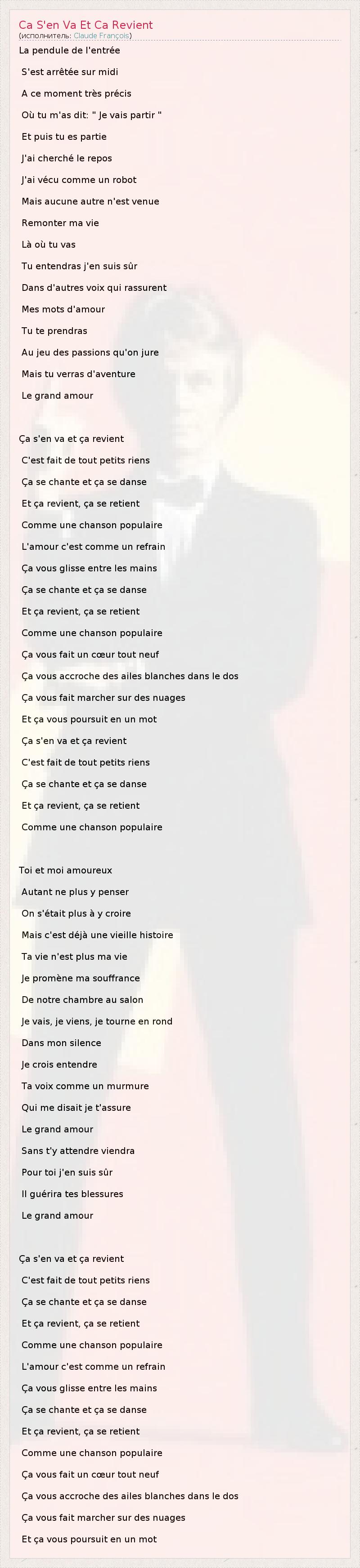 La pendule de l'entrée S'est arrêtée sur midi A ce moment très précis Où tu m'as dit: " Je vais partir " Et puis tu es partie J'ai cherché le repos J'ai vécu comme un robot Mais aucune autre n'est venue Remonter ma vie Là où tu vas Tu entendras j'en suis sûr Dans d'autres voix qui rassurent Mes mots d'amour Tu te prendras Au jeu des passions qu'on jure Mais tu verras d'aventure Le grand amour Ça s'en va et ça revient C'est fait de tout petits riens Ça se chante et ça se danse Et ça revient, ça se retient Comme une chanson populaire L'amour c'est comme un refrain Ça vous glisse entre les mains Ça se chante et ça se danse Et ça revient, ça se retient Comme une chanson populaire Ça vous fait un cœur tout neuf Ça vous accroche des ailes blanches dans le dos Ça vous fait marcher sur des nuages Et ça vous poursuit en un mot Ça s'en va et ça revient C'est fait de tout petits riens Ça se chante et ça se danse Et ça revient, ça se retient Comme une chanson populaire Toi et moi amoureux Autant ne plus y penser On s'était plus à y croire Mais c'est déjà une vieille histoire Ta vie n'est plus ma vie Je promène ma souffrance De notre chambre au salon Je vais, je viens, je tourne en rond Dans mon silence Je crois entendre Ta voix comme un murmure Qui me disait je t'assure Le grand amour Sans t'y attendre viendra Pour toi j'en suis sûr Il guérira tes blessures Le grand amour Ça s'en va et ça revient C'est fait de tout petits riens Ça se chante et ça se danse Et ça revient, ça se retient Comme une chanson populaire L'amour c'est comme un refrain Ça vous glisse entre les mains Ça se chante et ça se danse Et ça revient, ça se retient Comme une chanson populaire Ça vous fait un cœur tout neuf Ça vous accroche des ailes blanches dans le dos Ça vous fait marcher sur des nuages Et ça vous poursuit en un mot