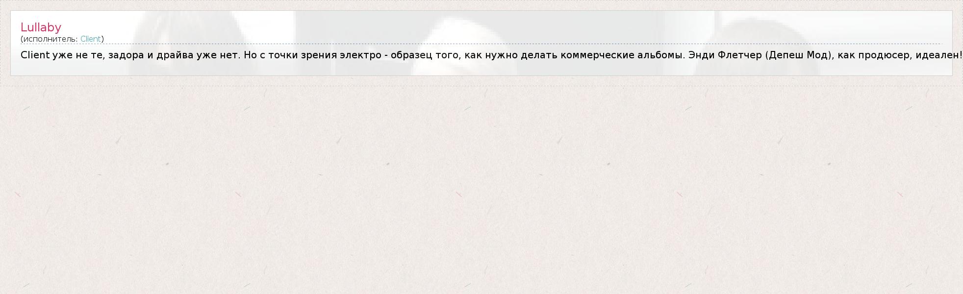 Client уже не те, задора и драйва уже нет. Но с точки зрения электро - образец того, как нужно делать коммерческие альбомы. Энди Флетчер (Депеш Мод), как продюсер, идеален!
