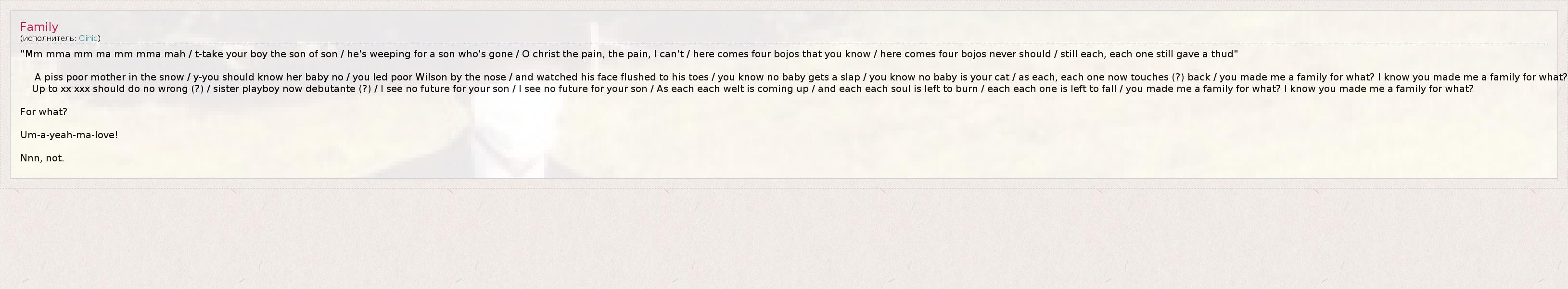 Up to xx xxx should do no wrong (?) / sister playboy now debutante (?) / I see no future for your son / I see no future for your son / As each each welt is coming up / and each each soul is left to burn / each each one is left to fall / you made me a family for what? I know you made me a family for what?
