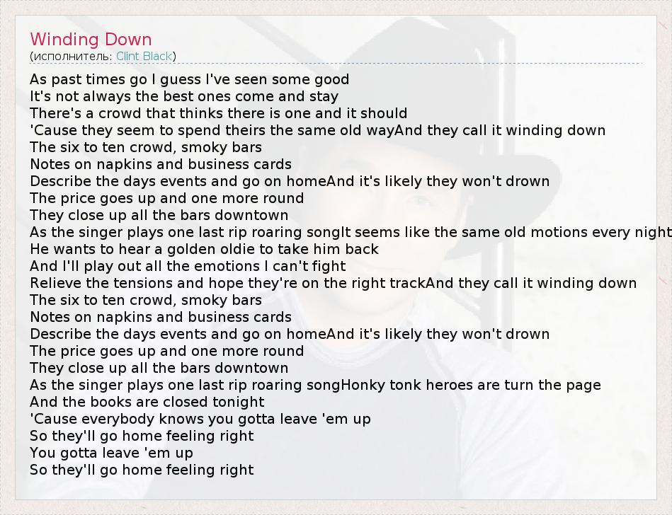 As past times go I guess I've seen some good It's not always the best ones come and stay There's a crowd that thinks there is one and it should 'Cause they seem to spend theirs the same old wayAnd they call it winding down The six to ten crowd, smoky bars Notes on napkins and business cards Describe the days events and go on homeAnd it's likely they won't drown The price goes up and one more round They close up all the bars downtown As the singer plays one last rip roaring songIt seems like the same old motions every night He wants to hear a golden oldie to take him back And I'll play out all the emotions I can't fight Relieve the tensions and hope they're on the right trackAnd they call it winding down The six to ten crowd, smoky bars Notes on napkins and business cards Describe the days events and go on homeAnd it's likely they won't drown The price goes up and one more round They close up all the bars downtown As the singer plays one last rip roaring songHonky tonk heroes are turn the page And the books are closed tonight 'Cause everybody knows you gotta leave 'em up So they'll go home feeling right You gotta leave 'em up So they'll go home feeling right
