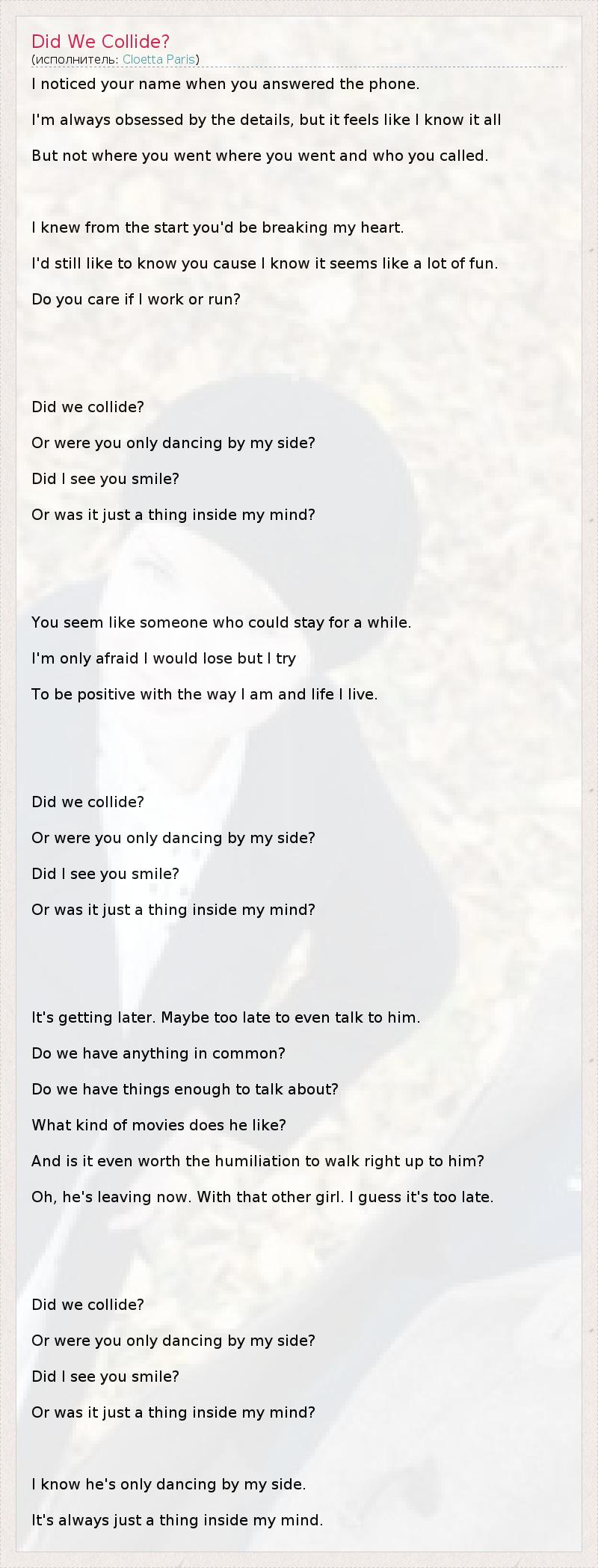 I noticed your name when you answered the phone. I'm always obsessed by the details, but it feels like I know it all But not where you went where you went and who you called. I knew from the start you'd be breaking my heart. I'd still like to know you cause I know it seems like a lot of fun. Do you care if I work or run? Did we collide? Or were you only dancing by my side? Did I see you smile? Or was it just a thing inside my mind? You seem like someone who could stay for a while. I'm only afraid I would lose but I try To be positive with the way I am and life I live. Did we collide? Or were you only dancing by my side? Did I see you smile? Or was it just a thing inside my mind? It's getting later. Maybe too late to even talk to him. Do we have anything in common? Do we have things enough to talk about? What kind of movies does he like? And is it even worth the humiliation to walk right up to him? Oh, he's leaving now. With that other girl. I guess it's too late. Did we collide? Or were you only dancing by my side? Did I see you smile? Or was it just a thing inside my mind? I know he's only dancing by my side. It's always just a thing inside my mind.