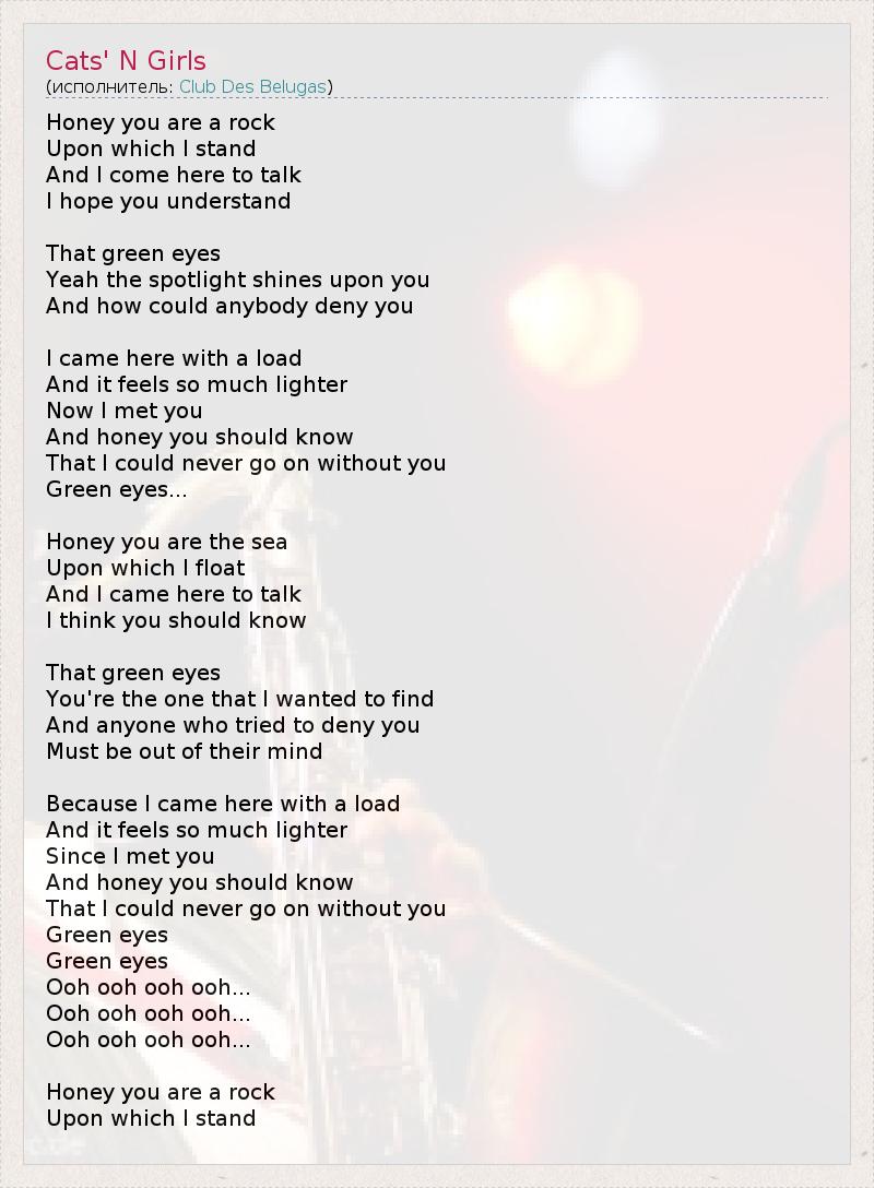 Honey you are a rock Upon which I stand And I come here to talk I hope you understand That green eyes Yeah the spotlight shines upon you And how could anybody deny you I came here with a load And it feels so much lighter Now I met you And honey you should know That I could never go on without you Green eyes... Honey you are the sea Upon which I float And I came here to talk I think you should know That green eyes You're the one that I wanted to find And anyone who tried to deny you Must be out of their mind Because I came here with a load And it feels so much lighter Since I met you And honey you should know That I could never go on without you Green eyes Green eyes Ooh ooh ooh ooh... Ooh ooh ooh ooh... Ooh ooh ooh ooh... Honey you are a rock Upon which I stand