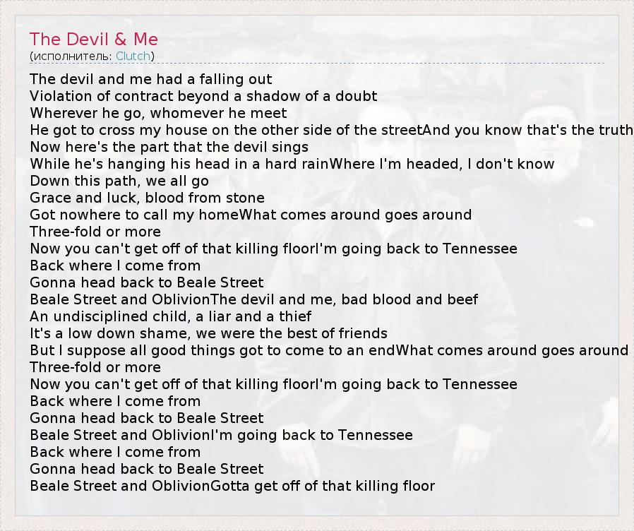 The devil and me had a falling out Violation of contract beyond a shadow of a doubt Wherever he go, whomever he meet He got to cross my house on the other side of the streetAnd you know that's the truth Now here's the part that the devil sings While he's hanging his head in a hard rainWhere I'm headed, I don't know Down this path, we all go Grace and luck, blood from stone Got nowhere to call my homeWhat comes around goes around Three-fold or more Now you can't get off of that killing floorI'm going back to Tennessee Back where I come from Gonna head back to Beale Street Beale Street and OblivionThe devil and me, bad blood and beef An undisciplined child, a liar and a thief It's a low down shame, we were the best of friends But I suppose all good things got to come to an endWhat comes around goes around Three-fold or more Now you can't get off of that killing floorI'm going back to Tennessee Back where I come from Gonna head back to Beale Street Beale Street and OblivionI'm going back to Tennessee Back where I come from Gonna head back to Beale Street Beale Street and OblivionGotta get off of that killing floor