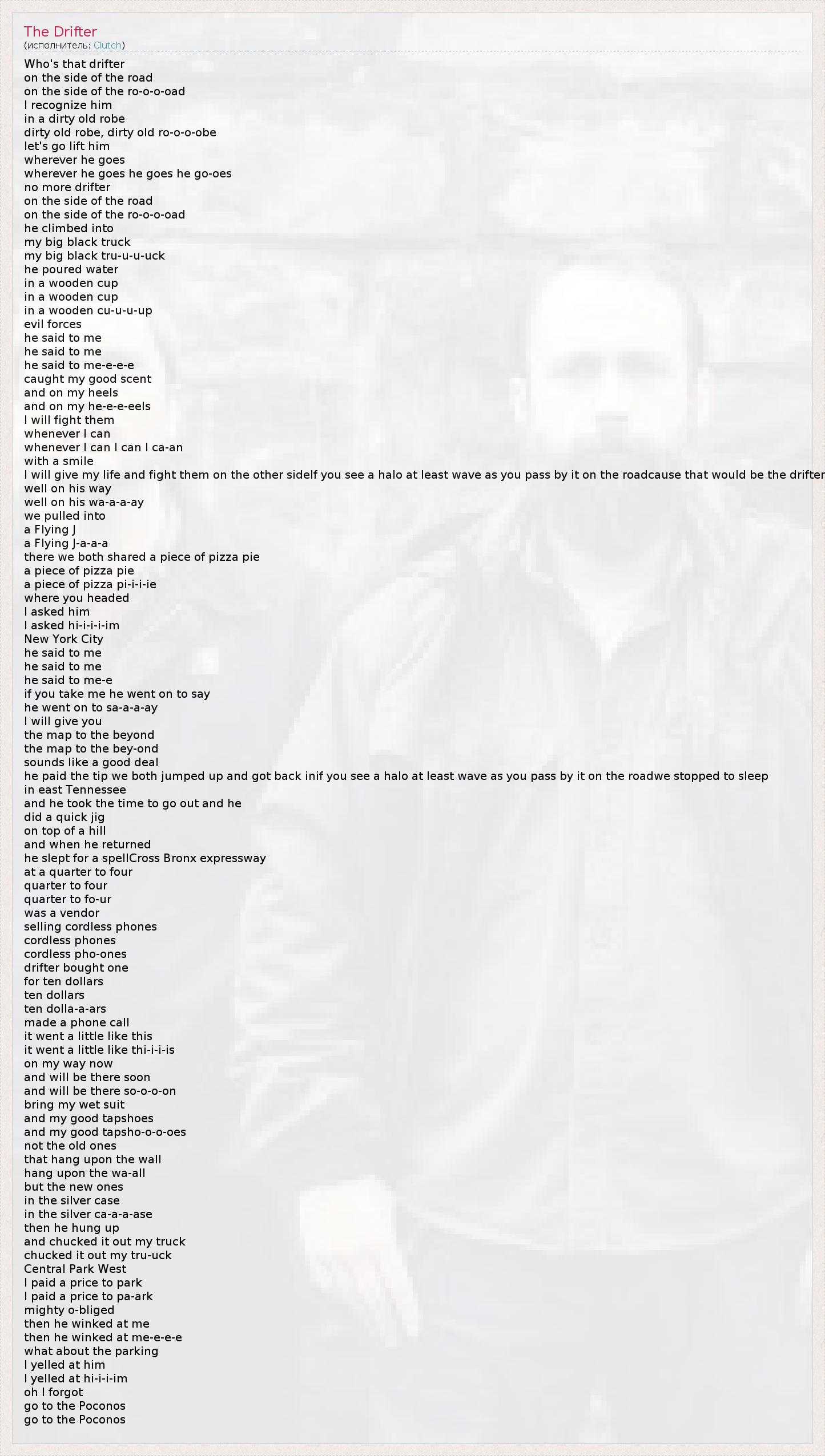Who's that drifter on the side of the road on the side of the ro-o-o-oad I recognize him in a dirty old robe dirty old robe, dirty old ro-o-o-obe let's go lift him wherever he goes wherever he goes he goes he go-oes no more drifter on the side of the road on the side of the ro-o-o-oad he climbed into my big black truck my big black tru-u-u-uck he poured water in a wooden cup in a wooden cup in a wooden cu-u-u-up evil forces he said to me he said to me he said to me-e-e-e caught my good scent and on my heels and on my he-e-e-eels I will fight them whenever I can whenever I can I can I ca-an with a smile I will give my life and fight them on the other sideIf you see a halo at least wave as you pass by it on the roadcause that would be the drifter well on his way well on his wa-a-a-ay we pulled into a Flying J a Flying J-a-a-a there we both shared a piece of pizza pie a piece of pizza pie a piece of pizza pi-i-i-ie where you headed I asked him I asked hi-i-i-i-im New York City he said to me he said to me he said to me-e if you take me he went on to say he went on to sa-a-a-ay I will give you the map to the beyond the map to the bey-ond sounds like a good deal he paid the tip we both jumped up and got back inif you see a halo at least wave as you pass by it on the roadwe stopped to sleep in east Tennessee and he took the time to go out and he did a quick jig on top of a hill and when he returned he slept for a spellCross Bronx expressway at a quarter to four quarter to four quarter to fo-ur was a vendor selling cordless phones cordless phones cordless pho-ones drifter bought one for ten dollars ten dollars ten dolla-a-ars made a phone call it went a little like this it went a little like thi-i-i-is on my way now and will be there soon and will be there so-o-o-on bring my wet suit and my good tapshoes and my good tapsho-o-o-oes not the old ones that hang upon the wall hang upon the wa-all but the new ones in the silver case in the silver ca-a-a-ase then he hung up and chucked it out my truck chucked it out my tru-uck Central Park West I paid a price to park I paid a price to pa-ark mighty o-bliged then he winked at me then he winked at me-e-e-e what about the parking I yelled at him I yelled at hi-i-i-im oh I forgot go to the Poconos go to the Poconos