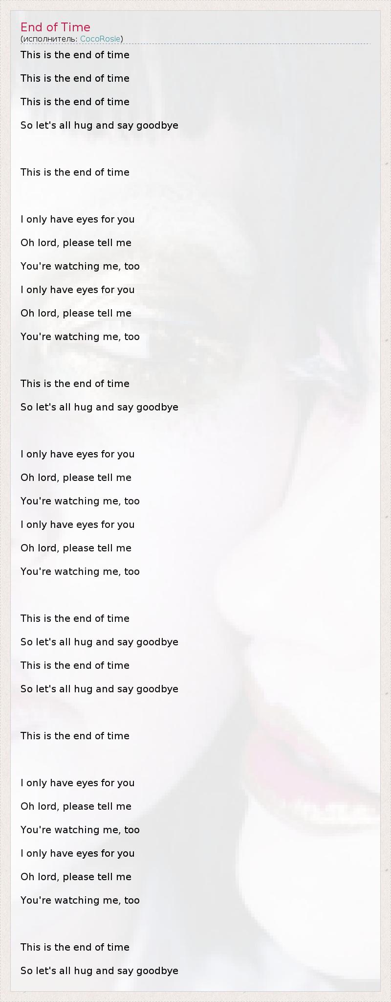 This is the end of time This is the end of time This is the end of time So let's all hug and say goodbye This is the end of time I only have eyes for you Oh lord, please tell me You're watching me, too I only have eyes for you Oh lord, please tell me You're watching me, too This is the end of time So let's all hug and say goodbye I only have eyes for you Oh lord, please tell me You're watching me, too I only have eyes for you Oh lord, please tell me You're watching me, too This is the end of time So let's all hug and say goodbye This is the end of time So let's all hug and say goodbye This is the end of time I only have eyes for you Oh lord, please tell me You're watching me, too I only have eyes for you Oh lord, please tell me You're watching me, too This is the end of time So let's all hug and say goodbye