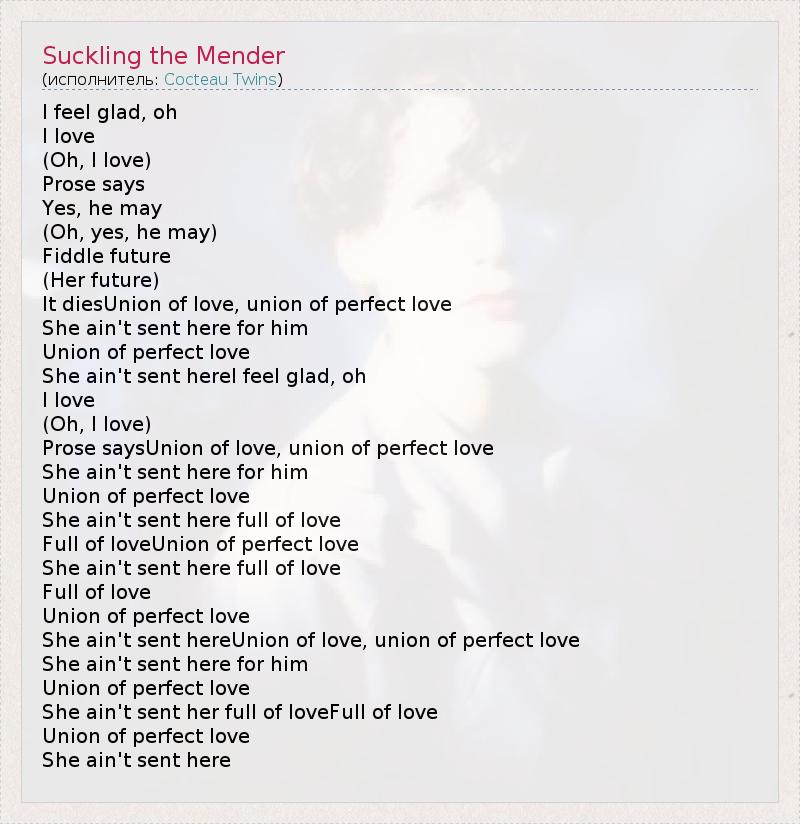 I feel glad, oh I love (Oh, I love) Prose says Yes, he may (Oh, yes, he may) Fiddle future (Her future) It diesUnion of love, union of perfect love She ain't sent here for him Union of perfect love She ain't sent hereI feel glad, oh I love (Oh, I love) Prose saysUnion of love, union of perfect love She ain't sent here for him Union of perfect love She ain't sent here full of love Full of loveUnion of perfect love She ain't sent here full of love Full of love Union of perfect love She ain't sent hereUnion of love, union of perfect love She ain't sent here for him Union of perfect love She ain't sent her full of loveFull of love Union of perfect love She ain't sent here