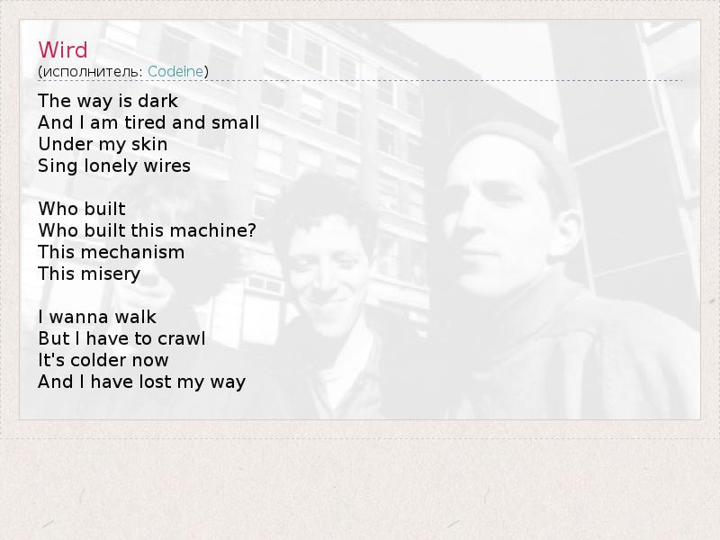 Это интересно:Codeine is an American indie rock/slowcore band formed in 1989 by members Stephen Immerwahr (vocal, bass), Chris Brokaw (drums), and John Engle (guitar). Codeine pioneered the slowcore and sadcore subgenres of indie rock, but with a more experimental attitude than other bands in the genre, such as Low, Idaho and Red House Painters. The band's original tone, marked by slow tempos, Immerwahr's nasal vocals, and Engle's ringing Telecaster, did not evolve much during their career.Codeine released their first album "Frigid Stars" on the German label Glitterhouse in 1990. The album was released on Sub Pop the following year.Their second release, the short album "Barely... продолжение