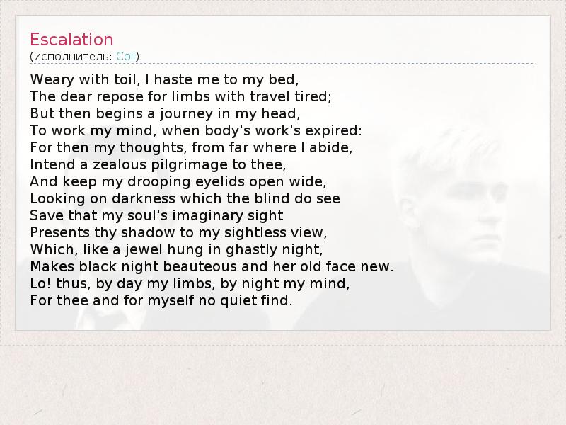 Weary with toil, I haste me to my bed, The dear repose for limbs with travel tired; But then begins a journey in my head, To work my mind, when body's work's expired: For then my thoughts, from far where I abide, Intend a zealous pilgrimage to thee, And keep my drooping eyelids open wide, Looking on darkness which the blind do see Save that my soul's imaginary sight Presents thy shadow to my sightless view, Which, like a jewel hung in ghastly night, Makes black night beauteous and her old face new. Lo! thus, by day my limbs, by night my mind, For thee and for myself no quiet find.