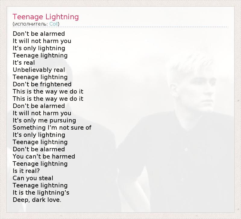 Don't be alarmed It will not harm you It's only lightning Teenage lightning It's real Unbelievably real Teenage lightning Don't be frightened This is the way we do it This is the way we do it Don't be alarmed It will not harm you It's only me pursuing Something I'm not sure of It's only lightning Teenage lightning Don't be alarmed You can't be harmed Teenage lightning Is it real? Can you steal Teenage lightning It is the lightning's Deep, dark love.