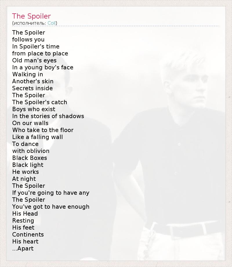 The Spoiler follows you In Spoiler's time from place to place Old man's eyes In a young boy's face Walking in Another's skin Secrets inside The Spoiler The Spoiler's catch Boys who exist In the stories of shadows On our walls Who take to the floor Like a falling wall To dance with oblivion Black Boxes Black light He works At night The Spoiler If you're going to have any The Spoiler You've got to have enough His Head Resting His feet Continents His heart ...Apart