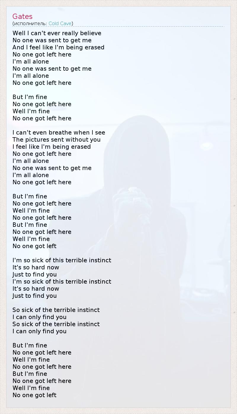 Это интересно:До того как встретится друг с другом, музыканты Cold Cave занимались другими более или менее известными проектами. Сара Липстейт, к примеру, успела наделать шума в нойз-группе Parts and Labor, а Кэрали МакЭлройтолько в начале этого года покинула известную инди-группу Xiu Xiu. Лидер Cold Cave Весли Эйшелд играл хардкор в различных формациях вроде Some Girls и Give Up the Ghost. Он же, к слову, прославился тем, что отсудил... продолжение