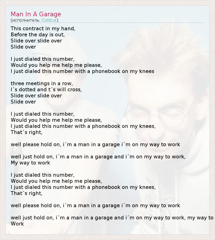 This contract in my hand, Before the day is out, Slide over slide over Slide over I just dialed this number, Would you help me help me please, I just dialed this number with a phonebook on my knees three meetings in a row, I´s dotted and t´s will cross, Slide over slide over Slide over I just dialed this number, Would you help me help me please, I just dialed this number with a phonebook on my knees, That´s right, well please hold on, i´m a man in a garage i´m on my way to work well just hold on, i´m a man in a garage and i´m on my way to work, My way to work I just dialed this number, Would you help me help me please, I just dialed this number with a phonebook on my knees, That´s right, well please hold on, i´m a man in a garage i´m on my way to work well just hold on, i´m a man in a garage and i´m on my way to work, my way to Work