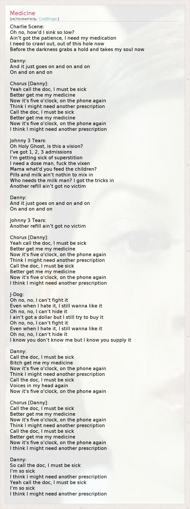[Charlie Scene]: О, нет, когда я успел пасть так низко? Не могу больше терпеть, мне нужно мое лекарство! Я должен выбраться из этой дыры, Пока темнота не забрала мою душу. [Danny]: И это продолжается снова, и снова, и снова... Снова, и снова, и снова... Припев [Danny]: Да, позовите доктора, я, должно быть, болен. Лучше дайте мне мое лекарство. Снова пять утра на экране телефона, Похоже, мне понадобится еще один рецепт. Позовите доктора, я, должно быть, болен. Лучше дайте мне мое лекарство. Снова пять утра на экране телефона, Похоже, мне понадобится еще один рецепт. [Johnny 3 Tears]: О, боже мой, это видение? У меня есть одно, два, три признания. Меня начинает тошнить от суеверий. Мне нужна доза, бл*ть, к черту эту мегеру! Мама, чем ты кормишь детей? Таблетки и молоко нельзя смешивать. Кому вообще нужно молоко? Я стащил их. От еще одной дозы вреда не будет. [Danny]: И это продолжается снова, и снова, и снова... Снова, и снова, и снова... [Johnny 3 Tears]: От еще одной дозы вреда не будет. Припев [Danny]: Да, позовите доктора, я, должно быть, болен. Лучше дайте мне мое лекарство. Снова пять утра на экране телефона, Похоже, мне понадобится еще один рецепт. Позовите доктора, я, должно быть, болен. Лучше дайте мне мое лекарство. Снова пять утра на экране телефона, Похоже, мне понадобится еще один рецепт. [J-Dog]: О, нет, нет, я не могу бороться с этим, Даже когда я ненавижу это, я все еще хочу это любить О, нет, нет, я не могу скрывать это, У меня нет денег, а я все равно пытаюсь их купить О, нет, нет, я не могу бороться с этим, Даже когда я ненавижу это, я все еще хочу это любить О, нет, нет, я не могу скрывать это Я знаю, вы меня не знаете, но я знаю, Вы поставляете их. [Danny]: Позовите доктора, я, должно быть, болен. Дайте мне, бл*ть, мое лекарство! Снова пять утра на экране телефона, Похоже, мне понадобится еще один рецепт. Позовите доктора, я, должно быть, болен. Опять голоса в моей голове, Снова пять утра на экране телефона... Припев [Danny]: Позовите доктора, я, должно быть, болен. Лучше дайте мне мое лекарство. Снова пять утра на экране телефона, Похоже, мне понадобится еще один рецепт. Позовите доктора, я, должно быть, болен. Лучше дайте мне мое лекарство. Снова пять утра на экране телефона, Похоже, мне понадобится еще один рецепт. [Danny]: Так позовите доктора, я, должно быть, болен. Я так устал. Похоже, мне понадобится еще один рецепт. Да, позовите доктора, я, должно быть, болен. Я так устал. Похоже, мне понадобится еще один рецепт.