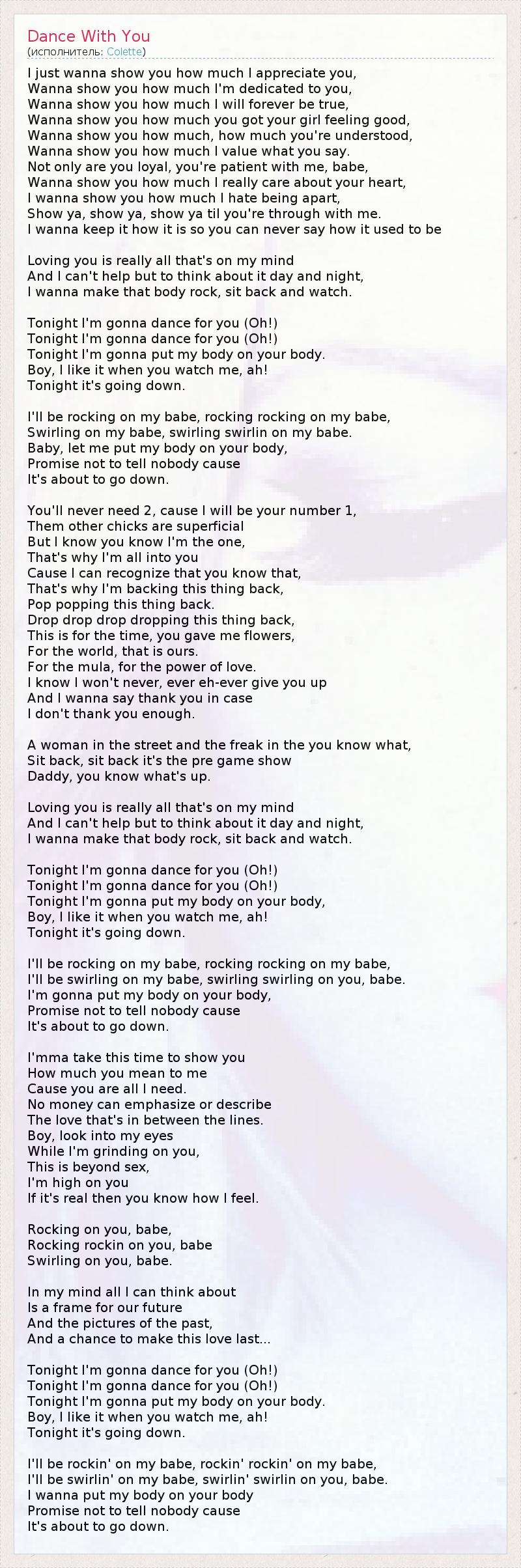 Я просто хочу показать, как я признательна тебе, Хочу показать, что я посвятила себя тебе, Хочу показать, что я всегда буду честна с тобой, Хочу показать, что все это время мне было хорошо с тобой, Хочу показать, как прекрасно, прекрасно тебя понимаю, Хочу показать, как я очень ценю все, что ты мне сказал. Ты не просто верный, ты ко мне еще и терпелив, малыш, Хочу показать, что меня действительно волнуют твои чувства, Я хочу показать, что я ненавижу пребывать в разлуке с тобой, Показать тебе, показать тебе, показать тебе, пока мы не расстались. Я хочу оставить все как есть, так что тебе не придется говорить, что это было... Любовь к тебе - это действительно все, что сейчас у меня на уме, И я не могу не думать об этом днями и ночами, Я хочу, чтобы, обалдевший, ты откинулся и смотрел... Сегодня вечером я буду для тебя танцевать (О!) Сегодня вечером я буду для тебя танцевать (О!) Сегодня вечером мы сольемся телами, Малыш, я люблю, когда ты смотришь на меня! Сегодняшний вечер запомнится. Я буду раскачиваться на своем малыше, Совершать на нём круговые движения. Малыш, давай сольемся телами! Обещай никому не говорить, потому что Это запомнится навсегда. Тебе не понадобятся другие, потому что я у тебя на первом месте. Остальные девчонки поверхностны, Но я знаю, что я у тебя на первом месте, Вот почему я увлечена только тобой, Потому что признаю, что ты это знаешь, Вот почему я плачу тебе той же монетой, Плачу той же монетой, Плачу той же монетой. А это - за то время, что ты дарил мне цветы, За весь мир, что принадлежит нам. Еще у нас есть деньги и сила любви. Я знаю, что никогда не откажусь от тебя. И я хочу поблагодарить тебя на случай, Если я благодарила тебя недостаточно. Леди на улице и фрик сам знаешь где. Откинься, ничего не делай, это представление-прелюдия, Малыш, ты знаешь, в чем дело... Любовь к тебе - это действительно все, что сейчас у меня на уме, И я не могу не думать об этом днями и ночами, Я хочу, чтобы, обалдевший, ты откинулся и смотрел... Сегодня вечером я буду для тебя танцевать (О!) Сегодня вечером я буду для тебя танцевать (О!) Сегодня вечером мы сольемся телами, Малыш, я люблю, когда ты смотришь на меня! Сегодняшний вечер запомнится. Я буду раскачиваться на своем малыше, Совершать на нём круговые движения. Малыш, давай сольемся телами! Обещай никому не говорить, потому что Это запомнится навсегда. Я делаю это, чтобы показать тебе, Как много ты для меня значишь, Потому что ты - все, что мне нужно. Ни за какие деньги не выразить и не описать Любовь, что между нами. Малыш, смотри мне в глаза, Пока я двигаю бёдрами на тебе. Это больше, чем секс, Я тащусь от тебя. И если всё по-настоящему, то ты понимаешь мои чувства... Раскачиваться на тебе, малыш, Двигаться на тебе, Совершать круговые движения.... Все, о чем я могу думать - Это рамка для нашего будущего И фото прошлого, И возможность сделать нашу любовь вечной... Сегодня вечером я буду для тебя танцевать (О!) Сегодня вечером я буду для тебя танцевать (О!) Сегодня вечером мы сольемся телами, Малыш, я люблю, когда ты смотришь на меня! Сегодняшний вечер запомнится. Я буду раскачиваться на своем малыше, Совершать на нём круговые движения. Малыш, давай сольемся телами! Обещай никому не говорить, потому что Это запомнится навсегда.