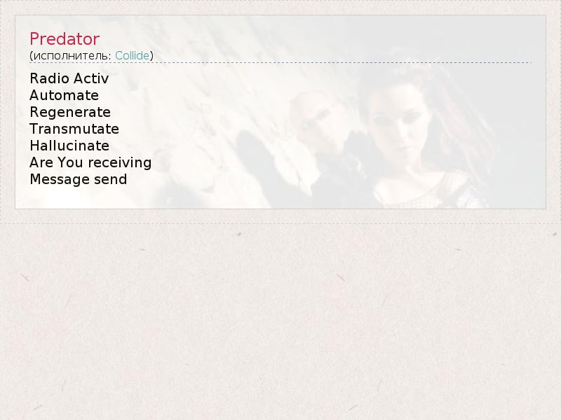 Это интересно:Collide — это электронно–готическая команда с женским вокалом (место у микрофона занимает очень привлекательное создание по имени kaRIN). Хороший ритм, своеобразный драйв, мелодичность и целый букет эмоций — все это присутствует в музыке дуэта. Состав:StatikkaRIN Scott Landes Rogerio Silva Kai Kurosawa Chaz Pease
