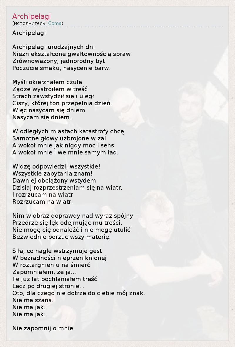 Это интересно:COMA — рок-группа, основанная в июне 1998 года в Лодзи.Первым изданным творением группы был сингл «Skaczemy/Pasażer» (Скачем/Пассажир). В конце 2003 года группе удалось подписать контракт с BMG Poland, что сделало возможным начать запись дебютного альбома — «Pierwsze wyjście z mroku» (Первый выход из мрака). Перед выходом первого студийного альбома группа сыскала популярность, выступая на разогреве у Казика... продолжение