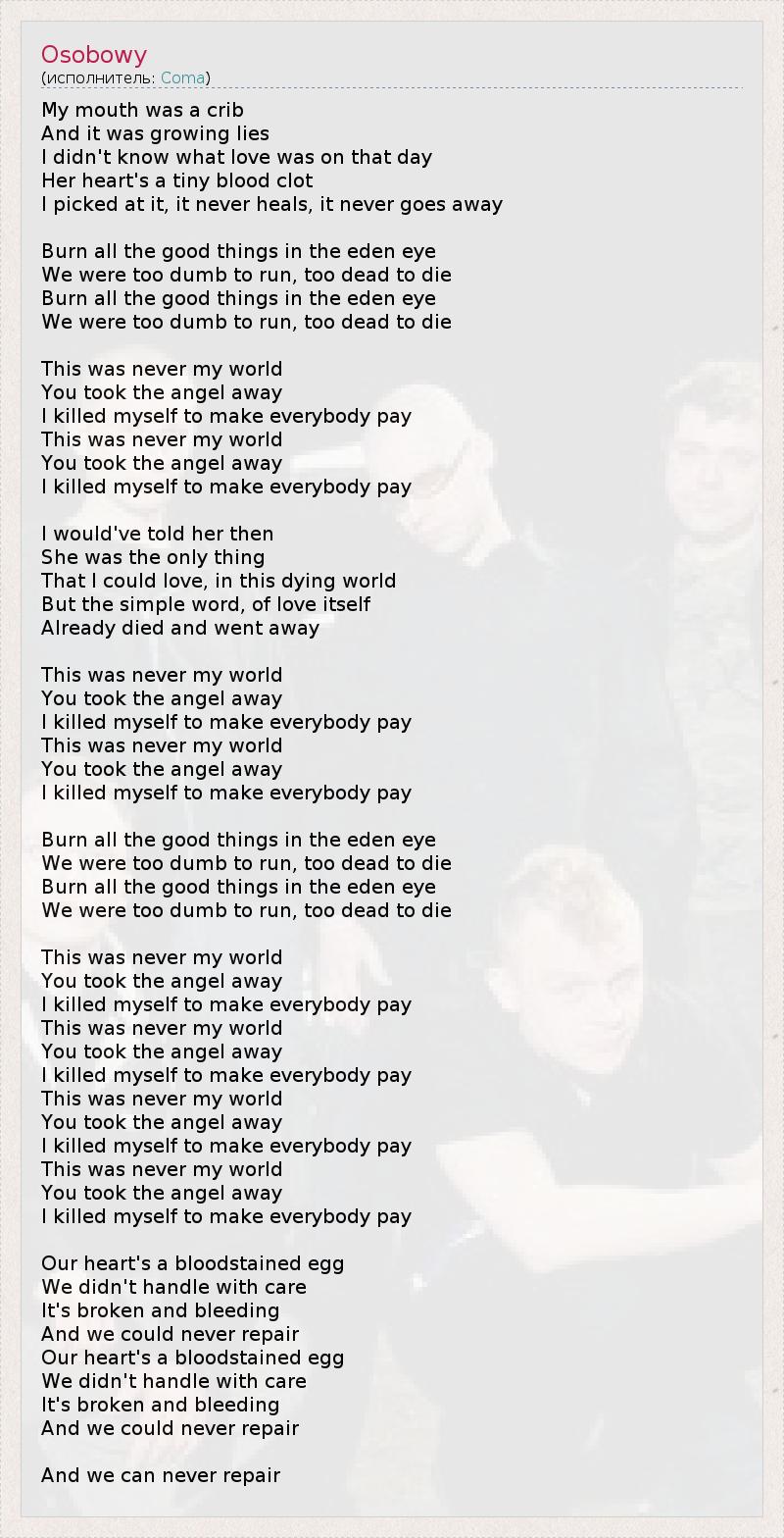 Мой рот - бездонный ларь, Множащий ложь. Я не знаю, что было любовью в тот день. Её сердце - кровавый сгусток, Я держал его в руках, оно никогда не заживёт, боль не пройдёт... Сжигайте всё хорошее в преддверье рая, Онемев, мы не могли бежать, мы были слишком мертвы, чтобы умереть. Сжигайте всё хорошее в преддверье рая, Онемев, мы не могли бежать, мы были слишком мертвы, чтобы умереть. Этот мир никогда не был для меня, Ты забрала ангела с собой. Я покончил с собой, чтобы заставить всех заплатить. Этот мир никогда не был для меня, Ты забрала ангела с собой. Я покончил с собой, чтобы заставить всех заплатить. Тогда я бы сказал ей, Что она была единственной, Кого я любил в этом умирающем мире. Но простые слова, такие как любовь, Уже мертвы и сгинули прочь.... Этот мир никогда не был для меня, Ты забрала ангела с собой. Я покончил с собой, чтобы заставить всех заплатить. Этот мир никогда не был для меня, Ты забрала ангела с собой. Я покончил с собой, чтобы заставить всех заплатить. Сжигайте всё хорошее в преддверье рая, Онемев, мы не могли бежать, мы были слишком мертвы, чтобы умереть. Сжигайте всё хорошее в преддверье рая, Онемев, мы не могли бежать, мы были слишком мертвы, чтобы умереть. Этот мир никогда не был для меня, Ты забрала ангела с собой. Я покончил с собой, чтобы заставить всех заплатить. Этот мир никогда не был для меня, Ты забрала ангела с собой. Я покончил с собой, чтобы заставить всех заплатить. Этот мир никогда не был для меня, Ты забрала ангела с собой. Я покончил с собой, чтобы заставить всех заплатить. Этот мир никогда не был для меня, Ты забрала ангела с собой. Я покончил с собой, чтобы заставить всех заплатить. Наше сердце - забрызганное кровью яйцо, Мы не смогли уберечь его, Оно разбито и истекает кровью, И мы не могли спасти его... Наше сердце - забрызганное кровью яйцо, Мы не смогли уберечь его, Оно разбито и истекает кровью, И мы не могли спасти его... И мы не сможем его спасти...