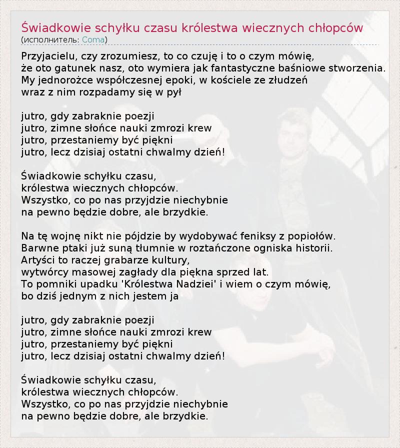 Przyjacielu, Czy zrozumiesz, сотрудничать czuję я к о czym mówię, że ото gatunek Nasz, ото wymiera Jak fantastyczne baśniowe stworzenia. Мой jednorożce współczesnej epoki, ж kościele ZE złudzeń wraz г NIM rozpadamy się ж Пыль jutro, гды zabraknie poezji jutro, зимне słońce науки zmrozi Krew jutro, przestaniemy być piękni jutro, lecz dzisiaj ostatni chwalmy dzień! Świadkowie schyłku czasu, królestwa wiecznych chłopców. Wszystko, со ро NAS przyjdzie niechybnie на pewno będzie Добре, пиво brzydkie. На те wojnę nikt ние pójdzie по wydobywać feniksy г popiołów. Barwne Ptaki już Суна tłumnie ж roztańczone ogniska historii. Artyści в raczej grabarze культуры, wytwórcy masowej zagłady DLA Piękna sprzed лат. Для pomniki upadku "Królestwa Nadziei" я WIEM о czym mówię, бо dziś Jednym г нич Jestem JA jutro, гды zabraknie poezji jutro, зимне słońce науки zmrozi Krew jutro, przestaniemy być piękni jutro, lecz dzisiaj ostatni chwalmy dzień! Świadkowie schyłku czasu, królestwa wiecznych chłopców. Wszystko, со ро NAS przyjdzie niechybnie на pewno będzie Добре, пиво brzydkie.