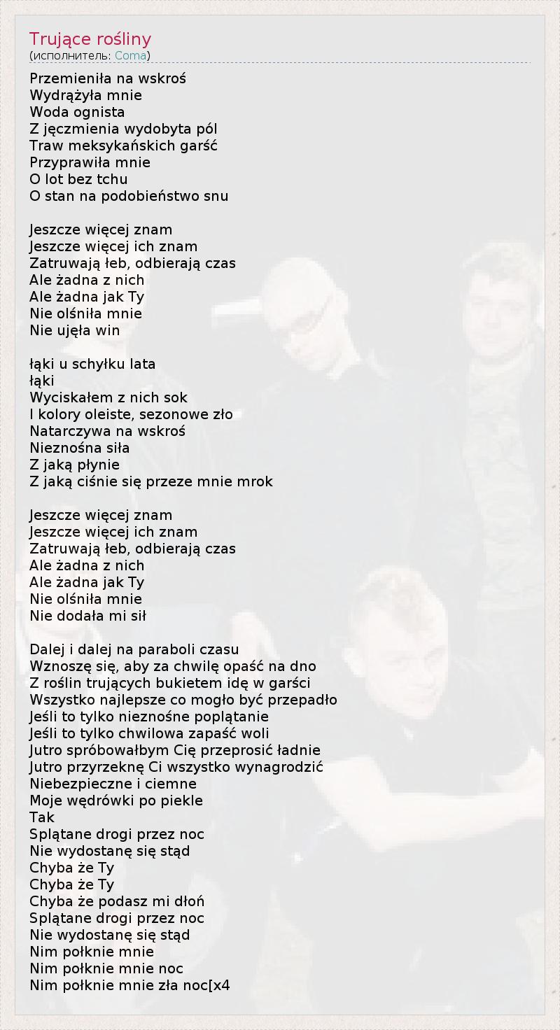 Przemieniła na wskroś Wydrążyła mnie Woda ognista Z jęczmienia wydobyta pól Traw meksykańskich garść Przyprawiła mnie O lot bez tchu O stan na podobieństwo snu Jeszcze więcej znam Jeszcze więcej ich znam Zatruwają łeb, odbierają czas Ale żadna z nich Ale żadna jak Ty Nie olśniła mnie Nie ujęła win łąki u schyłku lata łąki Wyciskałem z nich sok I kolory oleiste, sezonowe zło Natarczywa na wskroś Nieznośna siła Z jaką płynie Z jaką ciśnie się przeze mnie mrok Jeszcze więcej znam Jeszcze więcej ich znam Zatruwają łeb, odbierają czas Ale żadna z nich Ale żadna jak Ty Nie olśniła mnie Nie dodała mi sił Dalej i dalej na paraboli czasu Wznoszę się, aby za chwilę opaść na dno Z roślin trujących bukietem idę w garści Wszystko najlepsze co mogło być przepadło Jeśli to tylko nieznośne poplątanie Jeśli to tylko chwilowa zapaść woli Jutro spróbowałbym Cię przeprosić ładnie Jutro przyrzeknę Ci wszystko wynagrodzić Niebezpieczne i ciemne Moje wędrówki po piekle Tak Splątane drogi przez noc Nie wydostanę się stąd Chyba że Ty Chyba że Ty Chyba że podasz mi dłoń Splątane drogi przez noc Nie wydostanę się stąd Nim połknie mnie Nim połknie mnie noc Nim połknie mnie zła noc[x4