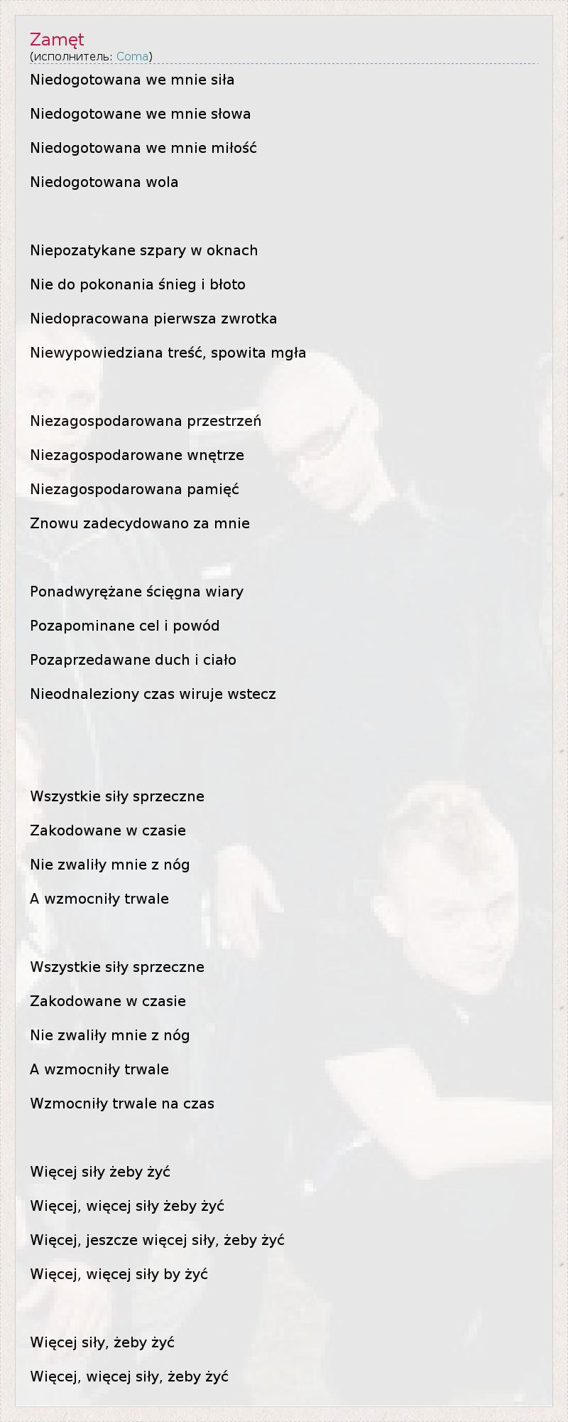 Это интересно:COMA — рок-группа, основанная в июне 1998 года в Лодзи.Первым изданным творением группы был сингл «Skaczemy/Pasażer» (Скачем/Пассажир). В конце 2003 года группе удалось подписать контракт с BMG Poland, что сделало возможным начать запись дебютного альбома — «Pierwsze wyjście z mroku» (Первый выход из мрака). Перед выходом первого студийного альбома группа сыскала популярность, выступая на разогреве у Казика... продолжение