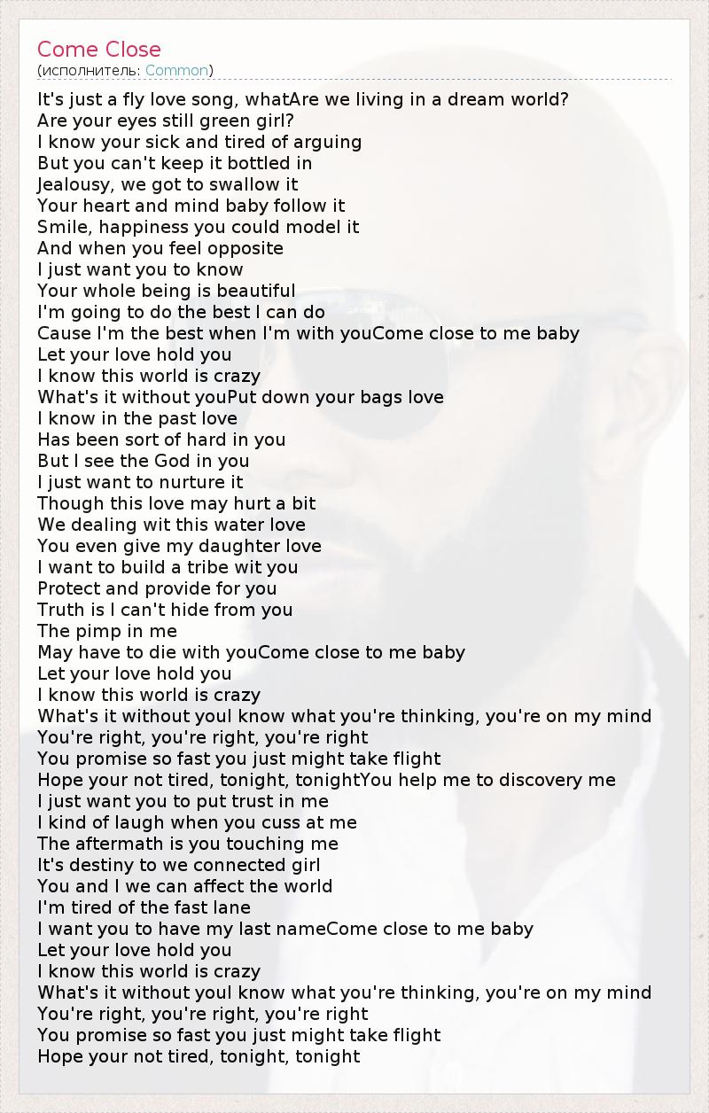 Это интересно:Common – это строгость и мягкость, красота и сила. Common – это стиль. Common -это сладкая вата и мягкий плед, оберег от невзгод и жаркое, всеобъемлющее солнце, греющее хип-хаперов по всей земле. Common – это лирика и теплый звук. Common – это корни хип-хопа в их современной заботливой интерпретации. В его музыку очень легко влюбиться, и влюбиться бесповоротно. Не сладкий, не перченый. Не слишком назидательный,... продолжение