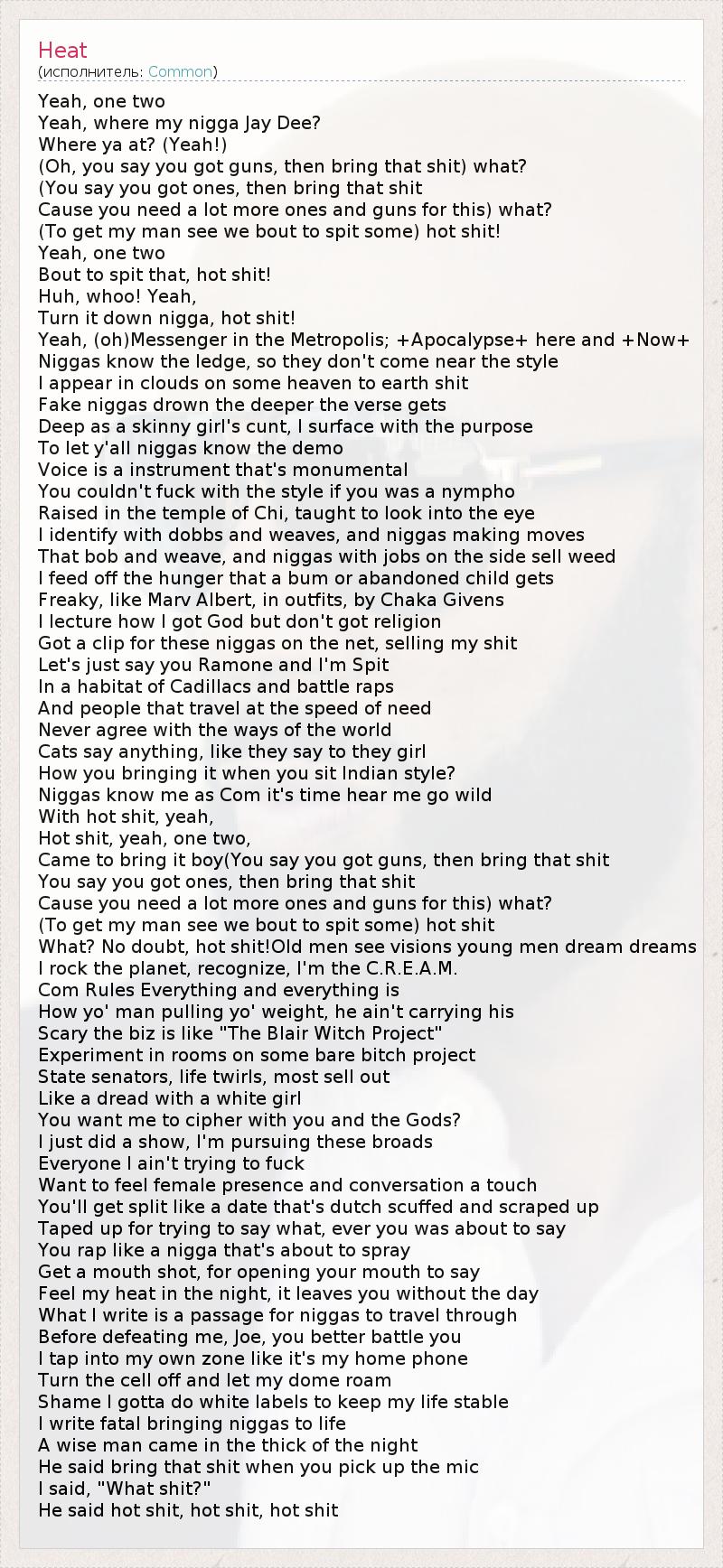 Yeah, one two Yeah, where my nigga Jay Dee? Where ya at? (Yeah!) (Oh, you say you got guns, then bring that shit) what? (You say you got ones, then bring that shit Cause you need a lot more ones and guns for this) what? (To get my man see we bout to spit some) hot shit! Yeah, one two Bout to spit that, hot shit! Huh, whoo! Yeah, Turn it down nigga, hot shit! Yeah, (oh)Messenger in the Metropolis; +Apocalypse+ here and +Now+ Niggas know the ledge, so they don't come near the style I appear in clouds on some heaven to earth shit Fake niggas drown the deeper the verse gets Deep as a skinny girl's cunt, I surface with the purpose To let y'all niggas know the demo Voice is a instrument that's monumental You couldn't fuck with the style if you was a nympho Raised in the temple of Chi, taught to look into the eye I identify with dobbs and weaves, and niggas making moves That bob and weave, and niggas with jobs on the side sell weed I feed off the hunger that a bum or abandoned child gets Freaky, like Marv Albert, in outfits, by Chaka Givens I lecture how I got God but don't got religion Got a clip for these niggas on the net, selling my shit Let's just say you Ramone and I'm Spit In a habitat of Cadillacs and battle raps And people that travel at the speed of need Never agree with the ways of the world Cats say anything, like they say to they girl How you bringing it when you sit Indian style? Niggas know me as Com it's time hear me go wild With hot shit, yeah, Hot shit, yeah, one two, Came to bring it boy(You say you got guns, then bring that shit You say you got ones, then bring that shit Cause you need a lot more ones and guns for this) what? (To get my man see we bout to spit some) hot shit What? No doubt, hot shit!Old men see visions young men dream dreams I rock the planet, recognize, I'm the C.R.E.A.M. Com Rules Everything and everything is How yo' man pulling yo' weight, he ain't carrying his Scary the biz is like "The Blair Witch Project" Experiment in rooms on some bare bitch project State senators, life twirls, most sell out Like a dread with a white girl You want me to cipher with you and the Gods? I just did a show, I'm pursuing these broads Everyone I ain't trying to fuck Want to feel female presence and conversation a touch You'll get split like a date that's dutch scuffed and scraped up Taped up for trying to say what, ever you was about to say You rap like a nigga that's about to spray Get a mouth shot, for opening your mouth to say Feel my heat in the night, it leaves you without the day What I write is a passage for niggas to travel through Before defeating me, Joe, you better battle you I tap into my own zone like it's my home phone Turn the cell off and let my dome roam Shame I gotta do white labels to keep my life stable I write fatal bringing niggas to life A wise man came in the thick of the night He said bring that shit when you pick up the mic I said, "What shit?" He said hot shit, hot shit, hot shit