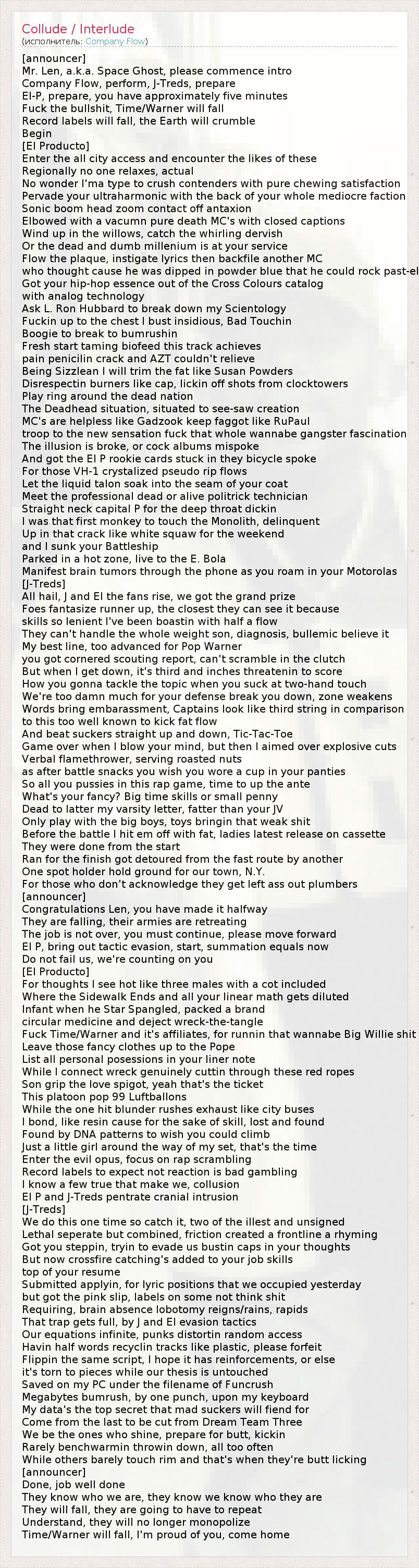 Это интересно:Company Flow - рэп-группа, которая некоторое время ассоциировалась с независимым звукозаписывающим лейблом Rawkus Records. Основали группу El-Producto (El-P), DJ Mr. Len и Bigg Jus в 1992 году в Квинсе, New York. У El-P был печальный опыт работы со звукозаписывающим лейблом на котором он пытался выпустить свою сольную пластинку и во времена своего студенчества он основал группу. Вместе с DJ Mr. Len, Company Flow в 1993 году записали "Juvenile... продолжение