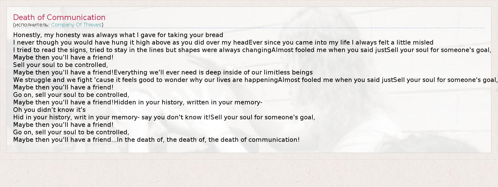 Honestly, my honesty was always what I gave for taking your bread I never though you would have hung it high above as you did over my headEver since you came into my life I always felt a little misled I tried to read the signs, tried to stay in the lines but shapes were always changingAlmost fooled me when you said justSell your soul for someone's goal, Maybe then you'll have a friend! Sell your soul to be controlled, Maybe then you'll have a friend!Everything we'll ever need is deep inside of our limitless beings We struggle and we fight 'cause it feels good to wonder why our lives are happeningAlmost fooled me when you said justSell your soul for someone's goal, Maybe then you'll have a friend! Go on, sell your soul to be controlled, Maybe then you'll have a friend!Hidden in your history, written in your memory- Oh you didn't know it's Hid in your history, writ in your memory- say you don't know it!Sell your soul for someone's goal, Maybe then you'll have a friend! Go on, sell your soul to be controlled, Maybe then you'll have a friend...In the death of, the death of, the death of communication!