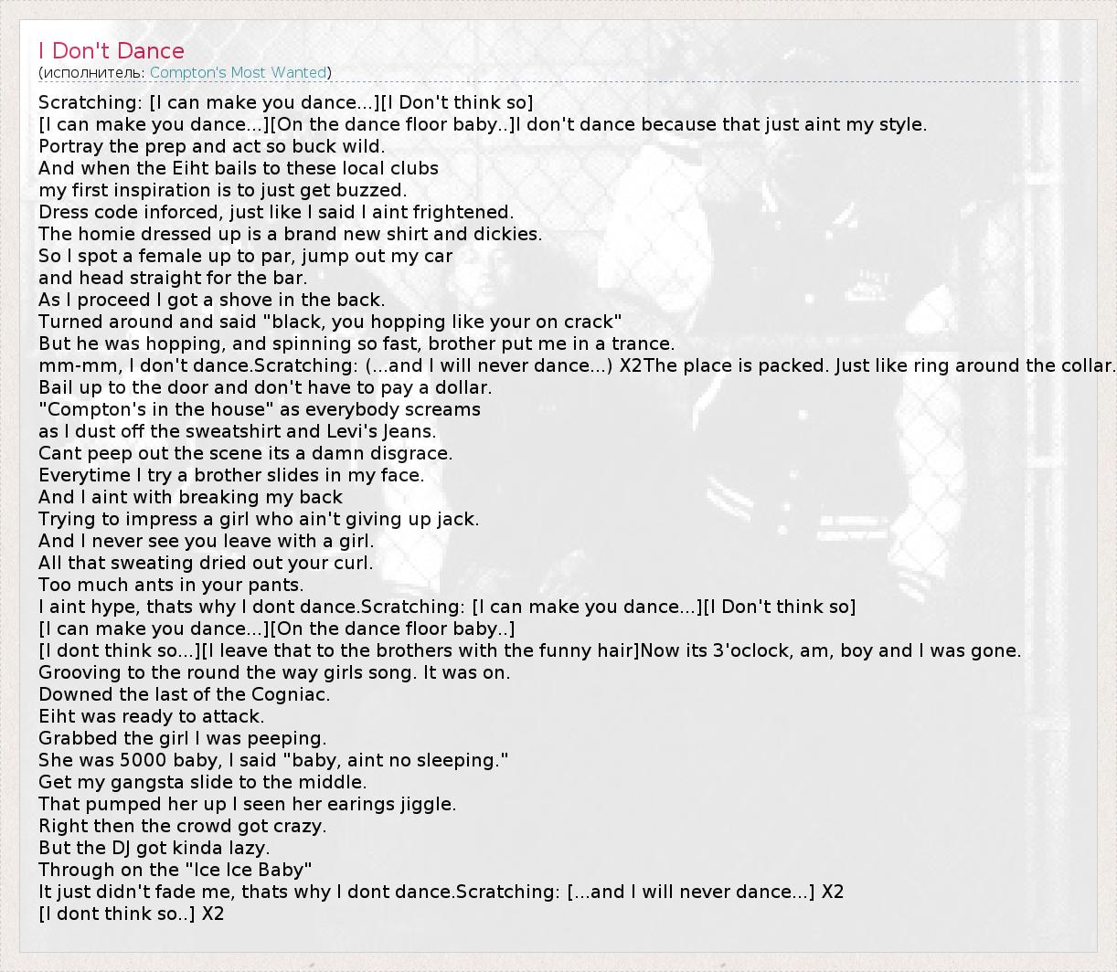 Scratching: [I can make you dance...][I Don't think so] [I can make you dance...][On the dance floor baby..]I don't dance because that just aint my style. Portray the prep and act so buck wild. And when the Eiht bails to these local clubs my first inspiration is to just get buzzed. Dress code inforced, just like I said I aint frightened. The homie dressed up is a brand new shirt and dickies. So I spot a female up to par, jump out my car and head straight for the bar. As I proceed I got a shove in the back. Turned around and said "black, you hopping like your on crack" But he was hopping, and spinning so fast, brother put me in a trance. mm-mm, I don't dance.Scratching: (...and I will never dance...) X2The place is packed. Just like ring around the collar. Bail up to the door and don't have to pay a dollar. "Compton's in the house" as everybody screams as I dust off the sweatshirt and Levi's Jeans. Cant peep out the scene its a damn disgrace. Everytime I try a brother slides in my face. And I aint with breaking my back Trying to impress a girl who ain't giving up jack. And I never see you leave with a girl. All that sweating dried out your curl. Too much ants in your pants. I aint hype, thats why I dont dance.Scratching: [I can make you dance...][I Don't think so] [I can make you dance...][On the dance floor baby..] [I dont think so...][I leave that to the brothers with the funny hair]Now its 3'oclock, am, boy and I was gone. Grooving to the round the way girls song. It was on. Downed the last of the Cogniac. Eiht was ready to attack. Grabbed the girl I was peeping. She was 5000 baby, I said "baby, aint no sleeping." Get my gangsta slide to the middle. That pumped her up I seen her earings jiggle. Right then the crowd got crazy. But the DJ got kinda lazy. Through on the "Ice Ice Baby" It just didn't fade me, thats why I dont dance.Scratching: [...and I will never dance...] X2 [I dont think so..] X2