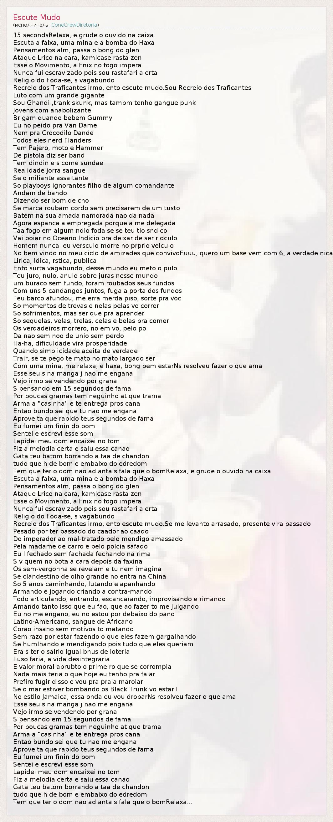 15 secondsRelaxa, e grude o ouvido na caixa Escuta a faixa, uma mina e a bomba do Haxa Pensamentos alm, passa o bong do glen Ataque Lrico na cara, kamicase rasta zen Esse o Movimento, a Fnix no fogo impera Nunca fui escravizado pois sou rastafari alerta Religio do Foda-se, s vagabundo Recreio dos Traficantes irmo, ento escute mudo.Sou Recreio dos Traficantes Luto com um grande gigante Sou Ghandi ,trank skunk, mas tambm tenho gangue punk Jovens com anabolizante Brigam quando bebem Gummy Eu no peido pra Van Dame Nem pra Crocodilo Dande Todos eles nerd Flanders Tem Pajero, moto e Hammer De pistola diz ser band Tem dindin e s come sundae Realidade jorra sangue Se o miliante assaltante So playboys ignorantes filho de algum comandante Andam de bando Dizendo ser bom de cho Se marca roubam cordo sem precisarem de um tusto Batem na sua amada namorada nao da nada Agora espanca a empregada porque a me delegada Taa fogo em algum ndio foda se se teu tio sndico Vai boiar no Oceano Indicio pra deixar de ser ridculo Homem nunca leu versculo morre no prprio veiculo No bem vindo no meu ciclo de amizades que convivoEuuu, quero um base vem com 6, a verdade nica Lirica, ldica, rstica, publica Ento surta vagabundo, desse mundo eu meto o pulo Teu juro, nulo, anulo sobre juras nesse mundo um buraco sem fundo, foram roubados seus fundos Com uns 5 candangos juntos, fuga a porta dos fundos Teu barco afundou, me erra merda piso, sorte pra voc So momentos de trevas e nelas pelas vo correr So sofrimentos, mas ser que pra aprender So sequelas, velas, trelas, celas e belas pra comer Os verdadeiros morrero, no em vo, pelo po Da nao sem noo de unio sem perdo Ha-ha, dificuldade vira prosperidade Quando simplicidade aceita de verdade Trair, se te pego te mato no mato largado ser Com uma mina, me relaxa, e haxa, bong bem estarNs resolveu fazer o que ama Esse seu s na manga j nao me engana Vejo irmo se vendendo por grana S pensando em 15 segundos de fama Por poucas gramas tem neguinho at que trama Arma a "casinha" e te entrega pros cana Entao bundo sei que tu nao me engana Aproveita que rapido teus segundos de fama Eu fumei um finin do bom Sentei e escrevi esse som Lapidei meu dom encaixei no tom Fiz a melodia certa e saiu essa canao Gata teu batom borrando a taa de chandon tudo que h de bom e embaixo do edredom Tem que ter o dom nao adianta s fala que o bomRelaxa, e grude o ouvido na caixa Escuta a faixa, uma mina e a bomba do Haxa Pensamentos alm, passa o bong do glen Ataque Lrico na cara, kamicase rasta zen Esse o Movimento, a Fnix no fogo impera Nunca fui escravizado pois sou rastafari alerta Religio do Foda-se, s vagabundo Recreio dos Traficantes irmo, ento escute mudo.Se me levanto arrasado, presente vira passado Pesado por ter passado do caador ao caado Do imperador ao mal-tratado pelo mendigo amassado Pela madame de carro e pelo polcia safado Eu l fechado sem fachada fechando na rima S v quem no bota a cara depois da faxina Os sem-vergonha se revelam e tu nem imagina Se clandestino de olho grande no entra na China So 5 anos caminhando, lutando e apanhando Armando e jogando criando a contra-mando Todo articulando, entrando, escancarando, improvisando e rimando Amando tanto isso que eu fao, que ao fazer to me julgando Eu no me engano, eu no estou por debaixo do pano Latino-Americano, sangue de Africano Corao insano sem motivos to matando Sem razo por estar fazendo o que eles fazem gargalhando Se humlhando e mendigando pois tudo que eles queriam Era s ter o salrio igual bnus de loteria Iluso faria, a vida desintegraria E valor moral abrubto o primeiro que se corrompia Nada mais teria o que hoje eu tenho pra falar Prefiro fugir disso e vou pra praia marolar Se o mar estiver bombando os Black Trunk vo estar l No estilo Jamaica, essa onda eu vou droparNs resolveu fazer o que ama Esse seu s na manga j nao me engana Vejo irmo se vendendo por grana S pensando em 15 segundos de fama Por poucas gramas tem neguinho at que trama Arma a "casinha" e te entrega pros cana Entao bundo sei que tu nao me engana Aproveita que rapido teus segundos de fama Eu fumei um finin do bom Sentei e escrevi esse som Lapidei meu dom encaixei no tom Fiz a melodia certa e saiu essa canao Gata teu batom borrando a taa de chandon tudo que h de bom e embaixo do edredom Tem que ter o dom nao adianta s fala que o bomRelaxa...