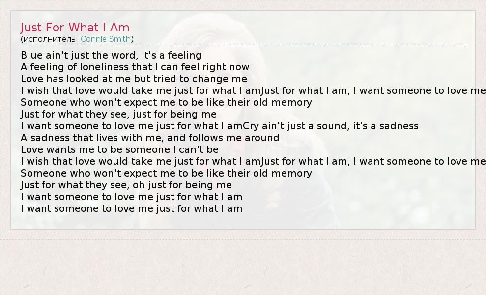 Blue ain't just the word, it's a feeling A feeling of loneliness that I can feel right now Love has looked at me but tried to change me I wish that love would take me just for what I amJust for what I am, I want someone to love me Someone who won't expect me to be like their old memory Just for what they see, just for being me I want someone to love me just for what I amCry ain't just a sound, it's a sadness A sadness that lives with me, and follows me around Love wants me to be someone I can't be I wish that love would take me just for what I amJust for what I am, I want someone to love me Someone who won't expect me to be like their old memory Just for what they see, oh just for being me I want someone to love me just for what I am I want someone to love me just for what I am