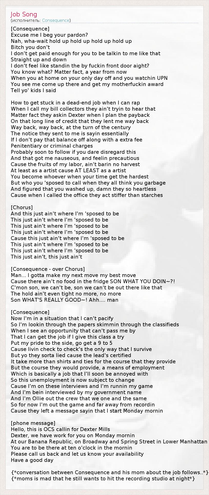 Это интересно:Consequence родился в Queens на заре расцвета хип-хопа, когда вся основная рэп-культура была сосредоточена на Восточном Побережье и все наиболее влиятельные люди этой сферы тусовались в New York City. В течении роста его карьеры, Consequence сталкивался не только с победой, но и с жестокой критикой со стороны хип-хоп собратьев. Одарённый парень, всегда знал о чём он пишет и ради чего он читает этот рэп."То,... продолжение
