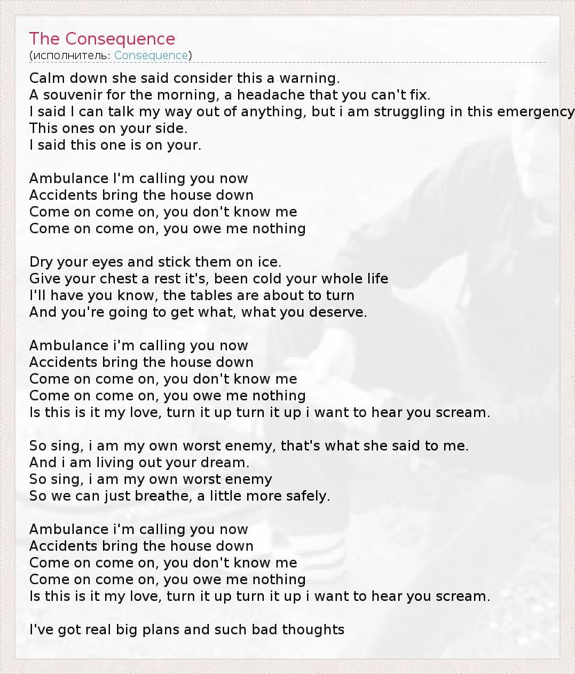 Это интересно:Consequence родился в Queens на заре расцвета хип-хопа, когда вся основная рэп-культура была сосредоточена на Восточном Побережье и все наиболее влиятельные люди этой сферы тусовались в New York City. В течении роста его карьеры, Consequence сталкивался не только с победой, но и с жестокой критикой со стороны хип-хоп собратьев. Одарённый парень, всегда знал о чём он пишет и ради чего он читает этот рэп."То,... продолжение