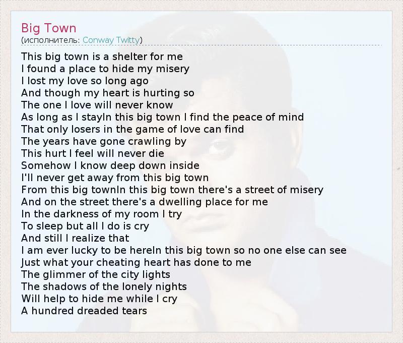 This big town is a shelter for me I found a place to hide my misery I lost my love so long ago And though my heart is hurting so The one I love will never know As long as I stayIn this big town I find the peace of mind That only losers in the game of love can find The years have gone crawling by This hurt I feel will never die Somehow I know deep down inside I'll never get away from this big town From this big townIn this big town there's a street of misery And on the street there's a dwelling place for me In the darkness of my room I try To sleep but all I do is cry And still I realize that I am ever lucky to be hereIn this big town so no one else can see Just what your cheating heart has done to me The glimmer of the city lights The shadows of the lonely nights Will help to hide me while I cry A hundred dreaded tears