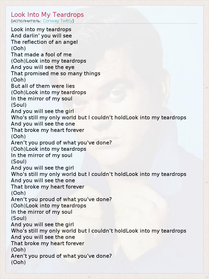 Look into my teardrops And darlin' you will see The reflection of an angel (Ooh) That made a fool of me (Ooh)Look into my teardrops And you will see the eye That promised me so many things (Ooh) But all of them were lies (Ooh)Look into my teardrops In the mirror of my soul (Soul) And you will see the girl Who's still my only world but I couldn't holdLook into my teardrops And you will see the one That broke my heart forever (Ooh) Aren't you proud of what you've done? (Ooh)Look into my teardrops In the mirror of my soul (Soul) And you will see the girl Who's still my only world but I couldn't holdLook into my teardrops And you will see the one That broke my heart forever (Ooh) Aren't you proud of what you've done? (Ooh)Look into my teardrops In the mirror of my soul (Soul) And you will see the girl Who's still my only world but I couldn't holdLook into my teardrops And you will see the one That broke my heart forever (Ooh) Aren't you proud of what you've done? (Ooh)
