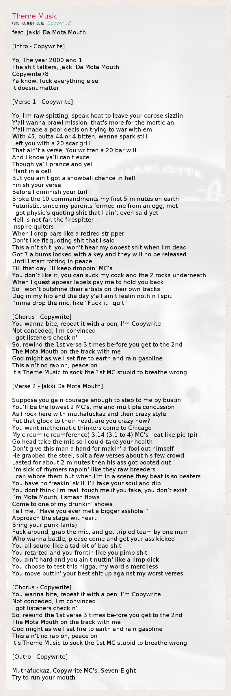 feat. Jakki Da Mota Mouth [Intro - Copywrite] Yo, The year 2000 and 1 The shit talkers, Jakki Da Mota Mouth Copywrite78 Ya know, fuck everything else It doesnt matter [Verse 1 - Copywrite] Yo, I'm raw spitting, speak heat to leave your corpse sizzlin' Y'all wanna brawl mission, that's more for the mortician Y'all made a poor decision trying to war with em With 45, outta 44 or 4 bitten, wanna spark still Left you with a 20 scar grill That ain't a verse, You written a 20 bar will And I know ya'll can't excel Though ya'll prance and yell Plant in a cell But you ain't got a snowball chance in hell Finish your verse Before I diminish your turf Broke the 10 commandments my first 5 minutes on earth Futuristic, since my parents formed me from an egg, met I got physic's quoting shit that I ain't even said yet Hell is not far, the firespitter Inspire quiters When I drop bars like a retired stripper Don't like fit quoting shit that I said This ain't shit, you won't hear my dopest shit when I'm dead Got 7 albums locked with a key and they will no be released Until I start rotting in peace Till that day I'll keep droppin' MC's You don't like it, you can suck my cock and the 2 rocks underneath When I guest appear labels pay me to hold you back So I won't outshine their artists on their own tracks Dug in my hip and the day y'all ain't feelin nothin I spit I'mma drop the mic, like "Fuck it I quit" [Chorus - Copywrite] You wanna bite, repeat it with a pen, I'm Copywrite Not conceded, I'm convinced I got listeners checkin' So, rewind the 1st verse 3 times be-fore you get to the 2nd The Mota Mouth on the track with me God might as well set fire to earth and rain gasoline This ain't no rap on, peace on It's Theme Music to sock the 1st MC stupid to breathe wrong [Verse 2 - Jakki Da Mota Mouth] Suppose you gain courage enough to step to me by bustin' You'll be the lowest 2 MC's, me and multiple concussion As I rock here with muthafuckaz and their crazy style Put that glock to their head, are you crazy now? You want mathematic thinkers come to Chicago My circum (circumference) 3.14 (3.1 to 4) MC's I eat like pie (pi) Go head take the mic so I could take your health Don't give this man a hand for makin' a fool out himself He grabbed the steel, spit a few verses about his few crowd Lasted for about 2 minutes then his ass got booted out I'm sick of rhymers rappin' like they raw breeders I can whore them but when I'm in a scene they beat is so beaters You have no freakin' skill, I'll take your soul and dip You dont think I'm real, touch me if you fake, you don't exist I'm Mota Mouth, I smash flows Come to one of my drunkin' shows Tell me, "Have you ever met a bigger asshole!" Approach the stage wit heart Bring your punk fan(s) Fuck around, grab the mic, and get tripled team by one man Who wanna battle, please come and get your ass kicked You all sound like a tad bit of bad shit You retarted and you frontin like you pimp shit You ain't hard and you ain't nuttin' like a limp dick You choose to test this nigga, my word's merciless You move puttin' your best shit up against my worst verses [Chorus - Copywrite] You wanna bite, repeat it with a pen, I'm Copywrite Not conceded, I'm convinced I got listeners checkin' So, rewind the 1st verse 3 times be-fore you get to the 2nd The Mota Mouth on the track with me God might as well set fire to earth and rain gasoline This ain't no rap on, peace on It's Theme Music to sock the 1st MC stupid to breathe wrong [Outro - Copywrite] Muthafuckaz, Copywrite MC's, Seven-Eight Try to run your mouth