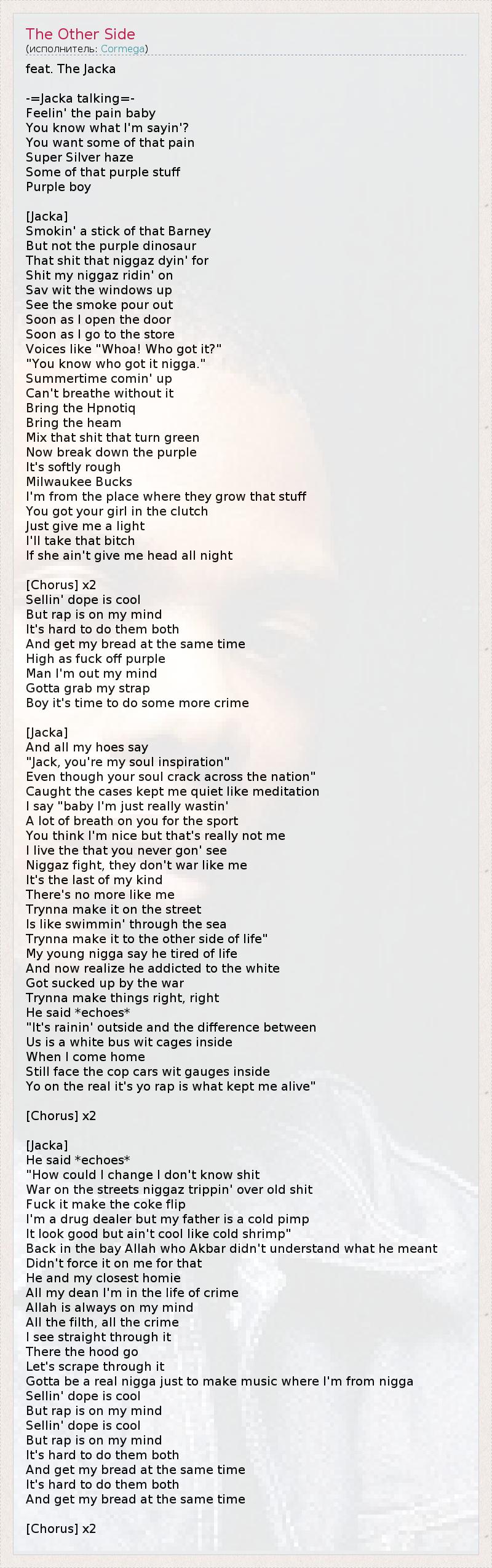 Это интересно:Ребенок улиц. Дилер. Осужденный. Cormega. Рожденный в желудке чудовища по имени Queensbridge, этот лирик-изгой с языками пламени в руках открыл свои глаза, чтобы надуть мир, который в противном случае погубил бы его. На его спокойном голосе отразилась черствость и жестокость жизни, а задумчивая манера исполнения заставляет понять больше, чем было сказано. Кормега, он же Кори МакКой, потерял свое... продолжение