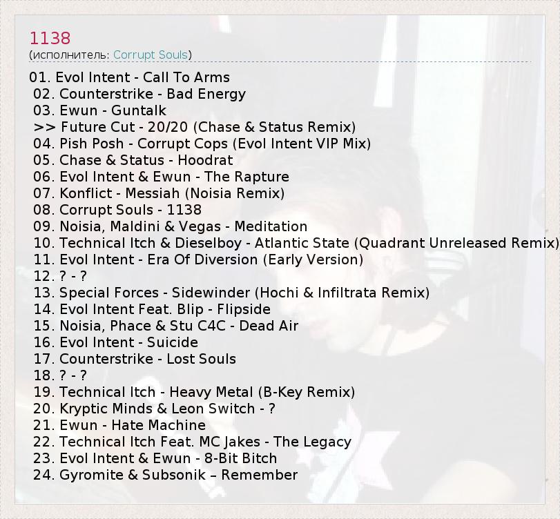 01. Evol Намерение - Call To Arms 02. Counterstrike - плохая энергия 03. Ewun - Gun Обсуждение & GT ; & GT ; Future Cut - 20/20 ( Chase & AMP ; Статус Remix ) 04. Pish Posh - продажный полицейский ( Evol Намерение VIP Mix) 05. Chase & AMP ; Статус - Hoodrat 06. Evol Намерение & AMP ; Ewun - Экстаз 07. Konflict - Мессия ( Noisia remix) 08. Коррумпированные души - 1138 09. Noisia , Мальдини & AMP ; Вегас - Медитация 10. Technical Itch & AMP ; Dieselboy - Атлантик Государственный ( квадрант Невыпущенный Remix ) 11. Evol Намерение - Эра утечки ( ранняя версия) 12. ? - ? 13. Спецназ - Sidewinder ( Ho Chi & ; Infiltrata Remix ) 14. Evol Намерение Feat. На экране радара - Flipside 15. Noisia , Phace & AMP ; Стю C4C - мертвый воздух 16. Evol Намерение - Самоубийство 17. Counterstrike - Lost Souls 18. ? - ? 19. Technical Itch - Heavy Metal (B -Key Remix ) 20. Kryptic Minds & AMP ; Leon Switch - ? 21. Ewun - Hate Machine 22. Technical Itch Feat . MC Jakes - Наследие 23. Evol Намерение & AMP ; Ewun - 8-разрядный сука 24. Gyromite & AMP ; Subsonik - Помните