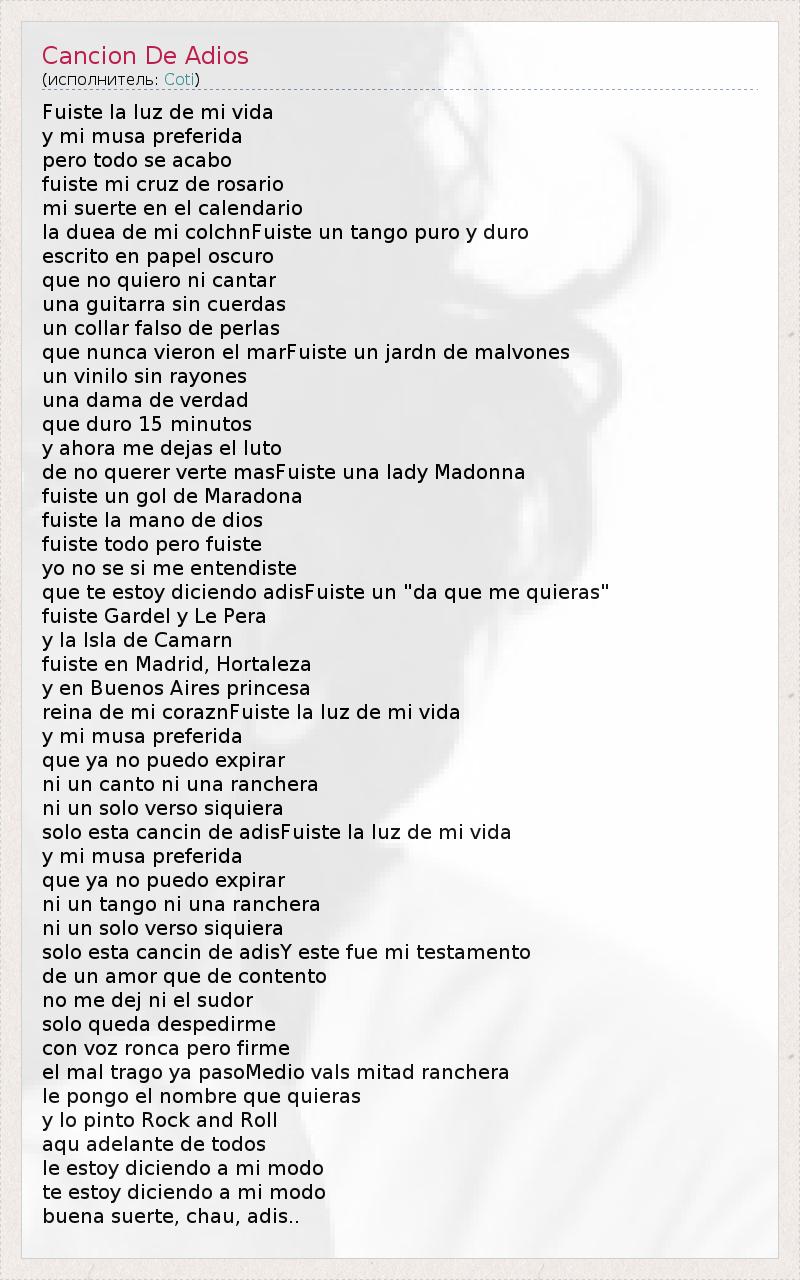 Fuiste la luz de mi vida y mi musa preferida pero todo se acabo fuiste mi cruz de rosario mi suerte en el calendario la duea de mi colchnFuiste un tango puro y duro escrito en papel oscuro que no quiero ni cantar una guitarra sin cuerdas un collar falso de perlas que nunca vieron el marFuiste un jardn de malvones un vinilo sin rayones una dama de verdad que duro 15 minutos y ahora me dejas el luto de no querer verte masFuiste una lady Madonna fuiste un gol de Maradona fuiste la mano de dios fuiste todo pero fuiste yo no se si me entendiste que te estoy diciendo adisFuiste un "da que me quieras" fuiste Gardel y Le Pera y la Isla de Camarn fuiste en Madrid, Hortaleza y en Buenos Aires princesa reina de mi coraznFuiste la luz de mi vida y mi musa preferida que ya no puedo expirar ni un canto ni una ranchera ni un solo verso siquiera solo esta cancin de adisFuiste la luz de mi vida y mi musa preferida que ya no puedo expirar ni un tango ni una ranchera ni un solo verso siquiera solo esta cancin de adisY este fue mi testamento de un amor que de contento no me dej ni el sudor solo queda despedirme con voz ronca pero firme el mal trago ya pasoMedio vals mitad ranchera le pongo el nombre que quieras y lo pinto Rock and Roll aqu adelante de todos le estoy diciendo a mi modo te estoy diciendo a mi modo buena suerte, chau, adis..