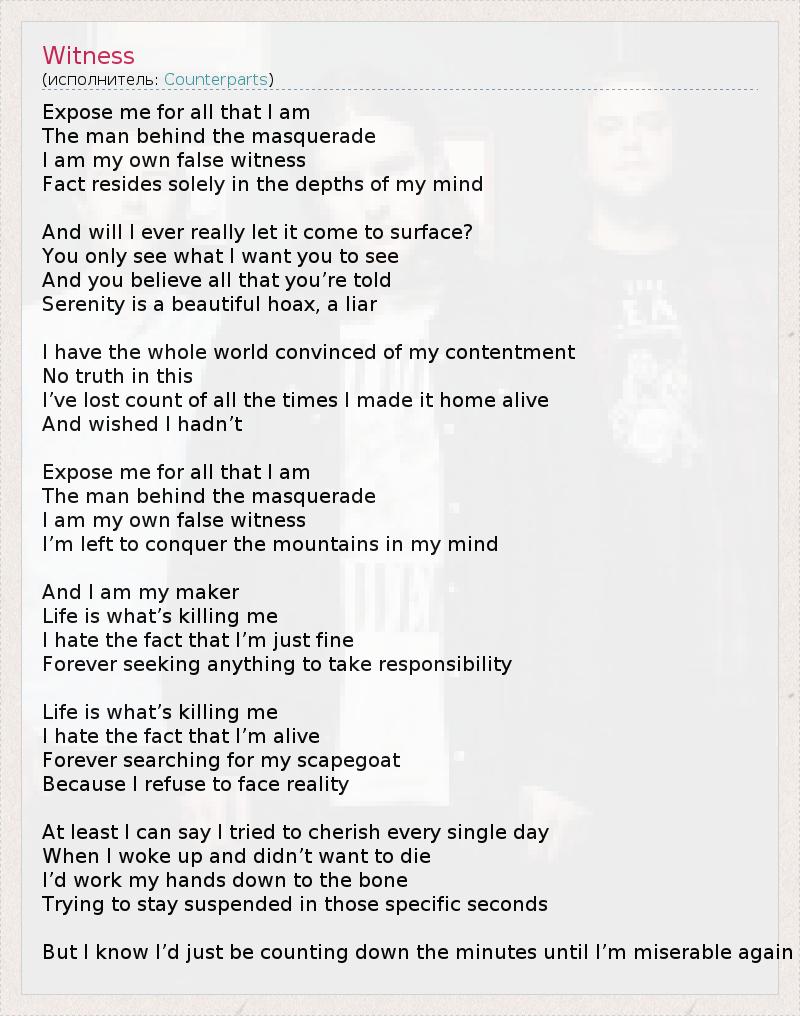 Это интересно:Существует как минимум 5 групп с точно таким же названием.Counterparts (Melodic Hardcore/Metalcore) - квинтет из Гамильтона, провинции Онтарио, Канада. Ребята сформировались в 2007 году. В марте 2009 стартовал тур по Канаде. В феврале 2010 вышел дебютный альбом Prophets, который содержал в себе 11 великолепнейших треков. С этим альбомом Counterparts быстро... продолжение