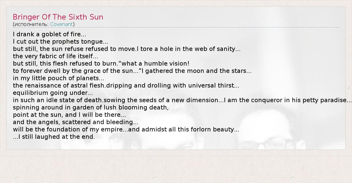 ГлавнаяИсполнителиCovenantBringer Of The Sixth Sun