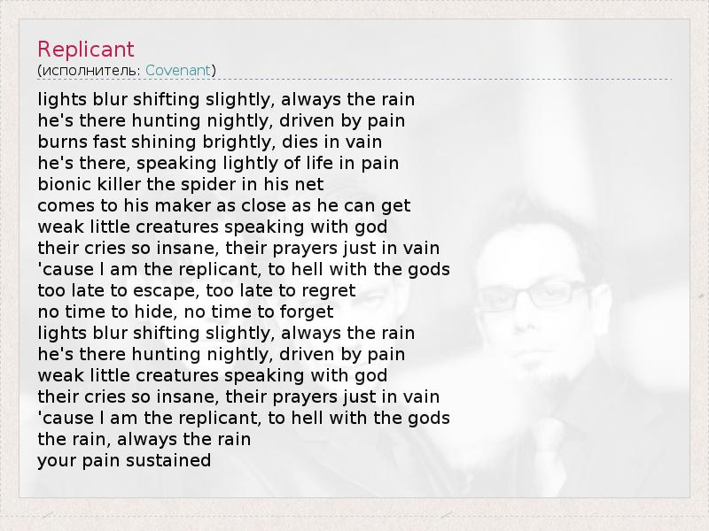 lights blur shifting slightly, always the rain he's there hunting nightly, driven by pain burns fast shining brightly, dies in vain he's there, speaking lightly of life in pain bionic killer the spider in his net comes to his maker as close as he can get weak little creatures speaking with god their cries so insane, their prayers just in vain 'cause I am the replicant, to hell with the gods too late to escape, too late to regret no time to hide, no time to forget lights blur shifting slightly, always the rain he's there hunting nightly, driven by pain weak little creatures speaking with god their cries so insane, their prayers just in vain 'cause I am the replicant, to hell with the gods the rain, always the rain your pain sustained