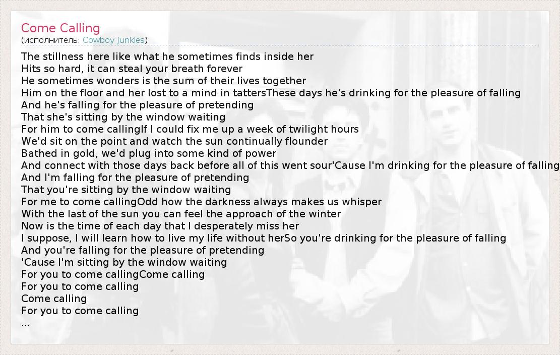 Это интересно:КОВБОЙ ДЖАНКИС , канадская альтернативная кантри-рок-группа. Первоначально называлась Hunder Project и была создана в 1979 в Торонто. В состав группы входили гитарист Майкл Тимминс (р. 21 апреля 1959, Монреаль, Канада) и басист Алан Антон, настоящее имя Алан Ализойводик (р. 22 июня 1959, Монреаль). Позже они сформировали британскую экспериментально-инструментальную группу Germinal, которая затем была переименована... продолжение