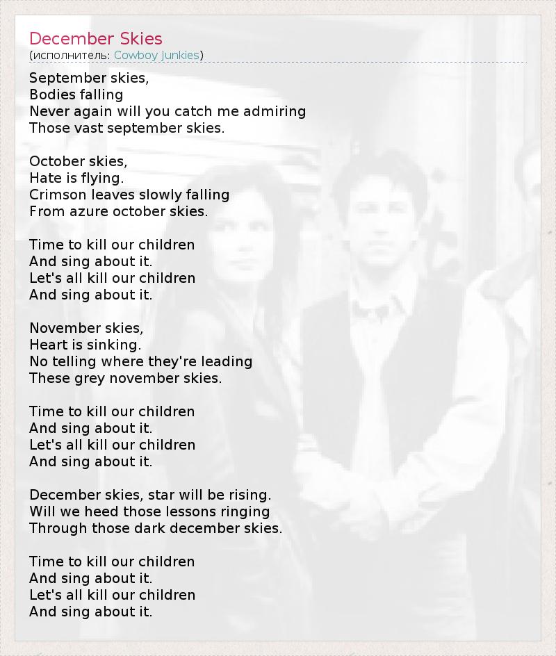 September skies, Bodies falling Never again will you catch me admiring Those vast september skies. October skies, Hate is flying. Crimson leaves slowly falling From azure october skies. Time to kill our children And sing about it. Let's all kill our children And sing about it. November skies, Heart is sinking. No telling where they're leading These grey november skies. Time to kill our children And sing about it. Let's all kill our children And sing about it. December skies, star will be rising. Will we heed those lessons ringing Through those dark december skies. Time to kill our children And sing about it. Let's all kill our children And sing about it.