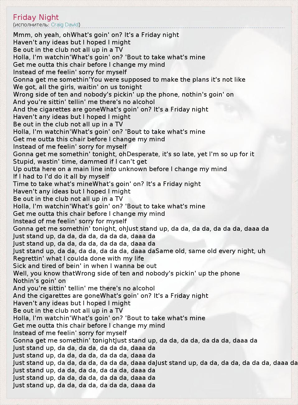 Mmm, oh yeah, ohWhat's goin' on? It's a Friday night Haven't any ideas but I hoped I might Be out in the club not all up in a TV Holla, I'm watchin'What's goin' on? 'Bout to take what's mine Get me outta this chair before I change my mind Instead of me feelin' sorry for myself Gonna get me somethin'You were supposed to make the plans it's not like We got, all the girls, waitin' on us tonight Wrong side of ten and nobody's pickin' up the phone, nothin's goin' on And you're sittin' tellin' me there's no alcohol And the cigarettes are goneWhat's goin' on? It's a Friday night Haven't any ideas but I hoped I might Be out in the club not all up in a TV Holla, I'm watchin'What's goin' on? 'Bout to take what's mine Get me outta this chair before I change my mind Instead of me feelin' sorry for myself Gonna get me somethin' tonight, ohDesperate, it's so late, yet I'm so up for it Stupid, wastin' time, dammed if I can't get Up outta here on a main line into unknown before I change my mind If I had to I'd do it all by myself Time to take what's mineWhat's goin' on? It's a Friday night Haven't any ideas but I hoped I might Be out in the club not all up in a TV Holla, I'm watchin'What's goin' on? 'Bout to take what's mine Get me outta this chair before I change my mind Instead of me feelin' sorry for myself Gonna get me somethin' tonight, ohJust stand up, da da, da da, da da da, daaa da Just stand up, da da, da da, da da da, daaa da Just stand up, da da, da da, da da da, daaa da Just stand up, da da, da da, da da da, daaa daSame old, same old every night, uh Regrettin' what I coulda done with my life Sick and tired of bein' in when I wanna be out Well, you know thatWrong side of ten and nobody's pickin' up the phone Nothin's goin' on And you're sittin' tellin' me there's no alcohol And the cigarettes are goneWhat's goin' on? It's a Friday night Haven't any ideas but I hoped I might Be out in the club not all up in a TV Holla, I'm watchin'What's goin' on? 'Bout to take what's mine Get me outta this chair before I change my mind Instead of me feelin' sorry for myself Gonna get me somethin' tonightJust stand up, da da, da da, da da da, daaa da Just stand up, da da, da da, da da da, daaa da Just stand up, da da, da da, da da da, daaa da Just stand up, da da, da da, da da da, daaa daJust stand up, da da, da da, da da da, daaa da Just stand up, da da, da da, da da da, daaa da Just stand up, da da, da da, da da da, daaa da Just stand up, da da, da da, da da da, daaa da